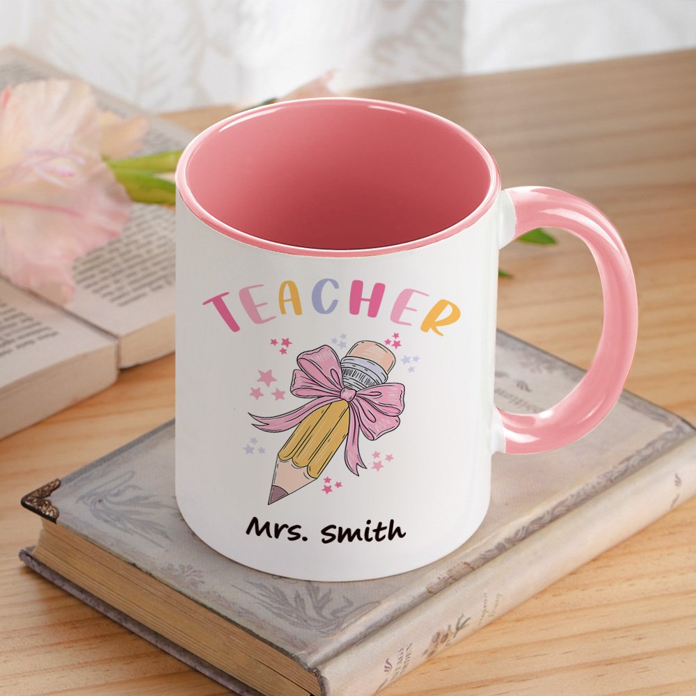 Our mug's unique design features a pencil element with a pink bow tied on it and stars embellished on it, which is exquisite and cute. The colourful title of "TEACHER" expresses respect and appreciation for teachers. You can add the teacher's name to the mug to create a unique gift.