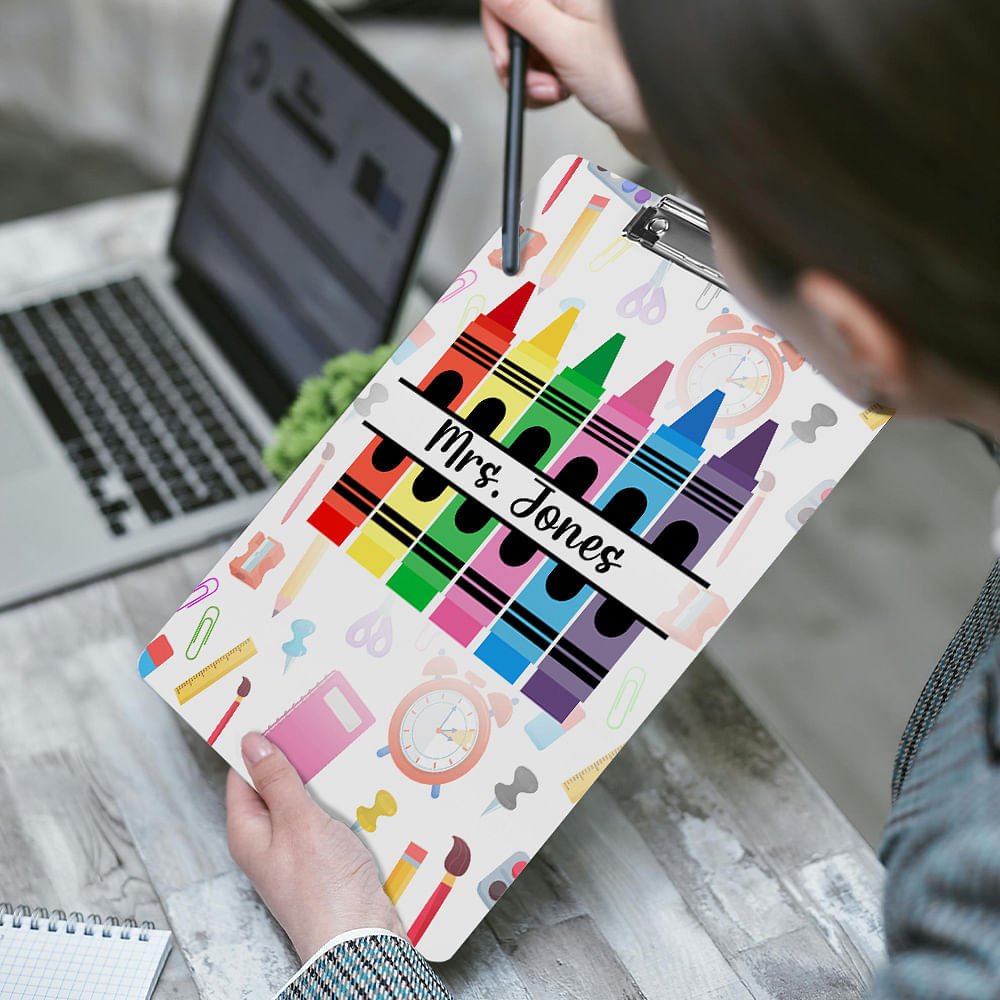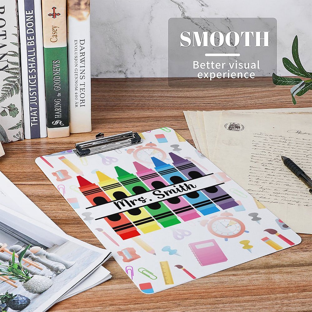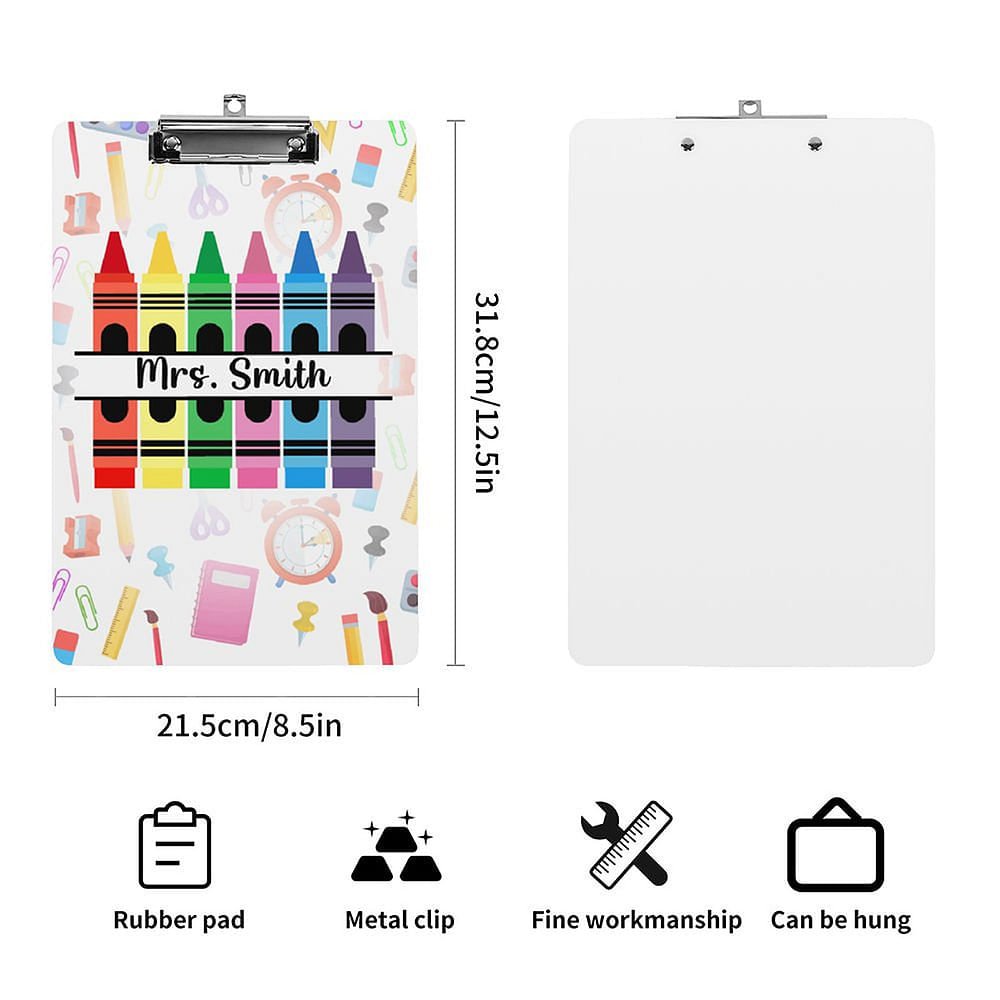 This clipboard has a crayon pattern printed in the middle and other teaching elements printed around it. The design of the clipboard is exquisite, and it has bright colours. The use of various patterns increases its visual appeal and interest. You can also customize the name on the board to make the clipboard more personal.