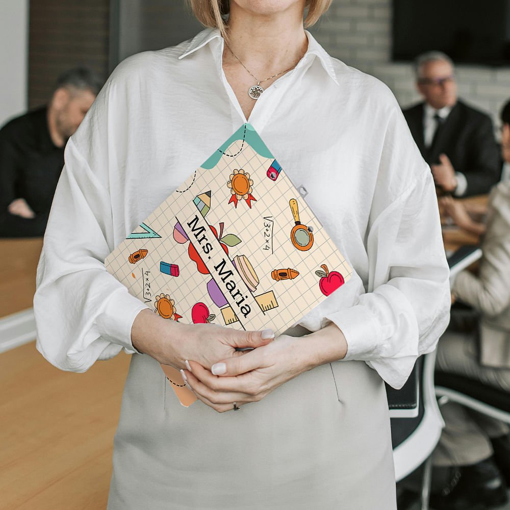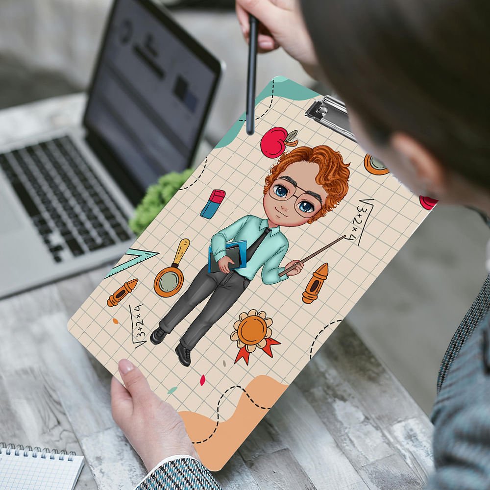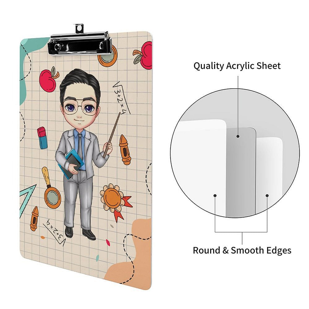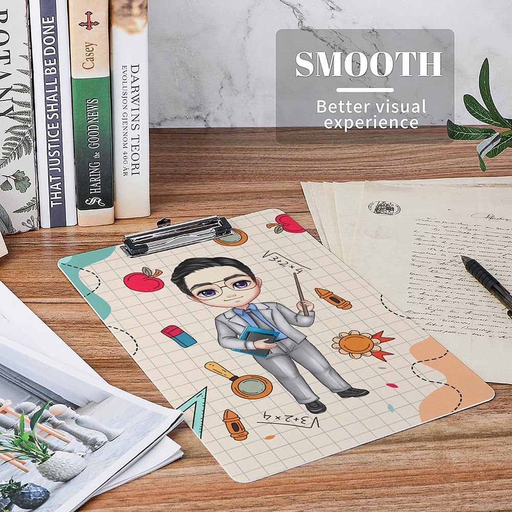 This clipboard has a cartoon teacher character printed in the middle, with patterns of teaching elements such as crayons, rulers, and Rubbers. The clipboard is beautifully designed and colourful, and the use of various patterns increases its visual appeal and fun. It is double-sided and customized. The front side can be customized with the teacher's cartoon image, and the back side can be customized with the teacher's name, making the clipboard more Personalized.