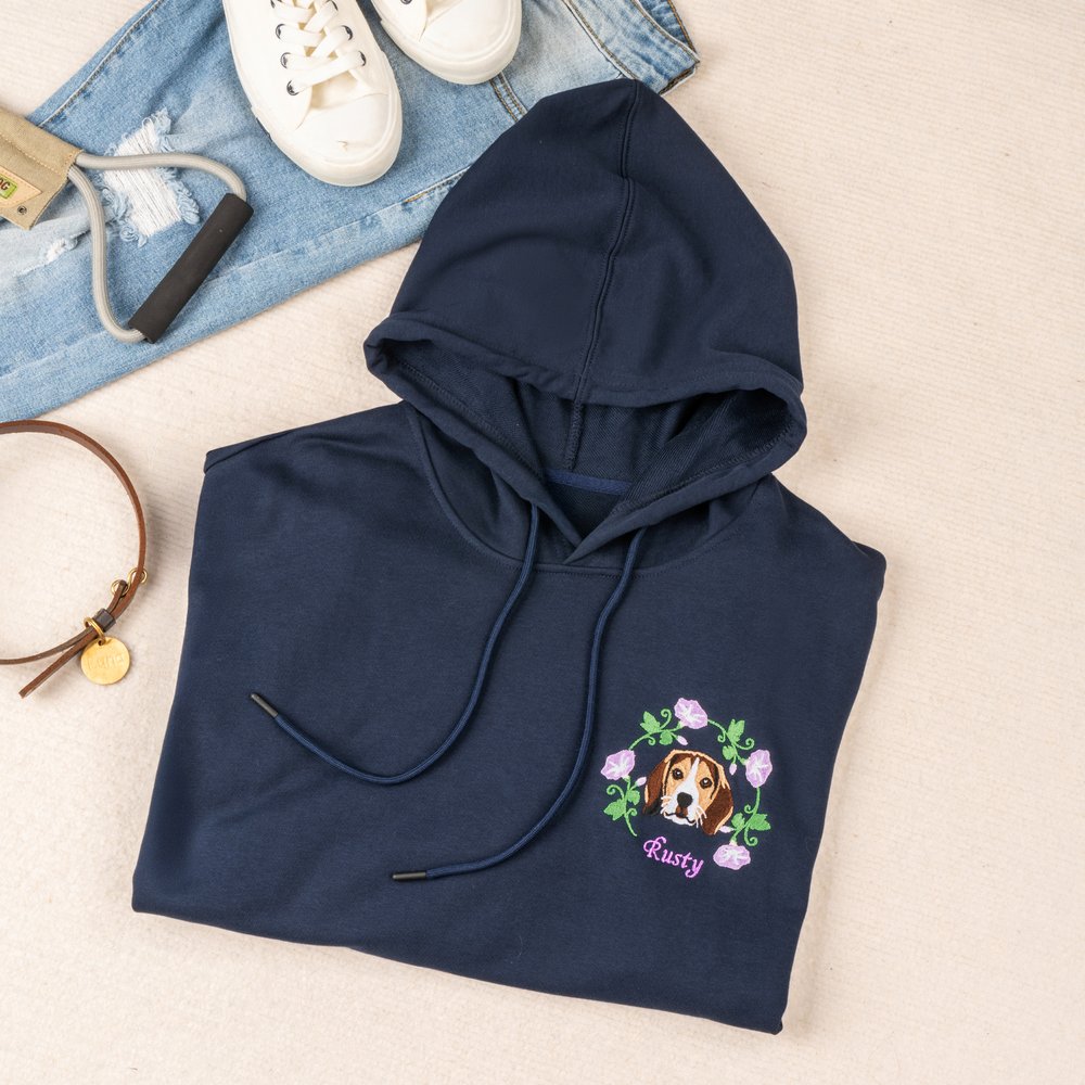 Customize your pet's adorable portrait, a special birth flower, and their name through exquisite embroidery, transforming this piece of clothing into a stylish commemoration of unique memories. Every detail tells the story of your relationship with your pet, transforming the image of your beloved pet into the perfect finishing touch for your everyday outfit.