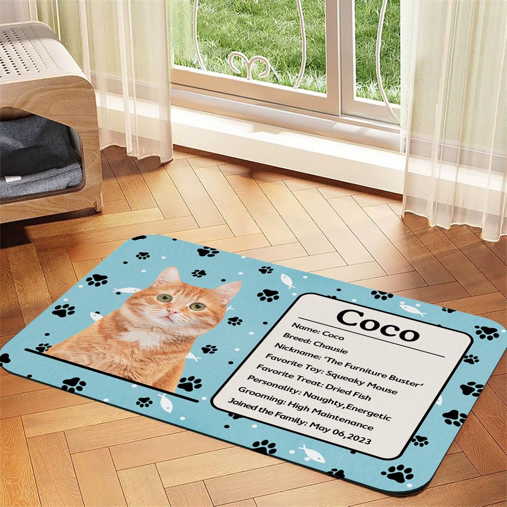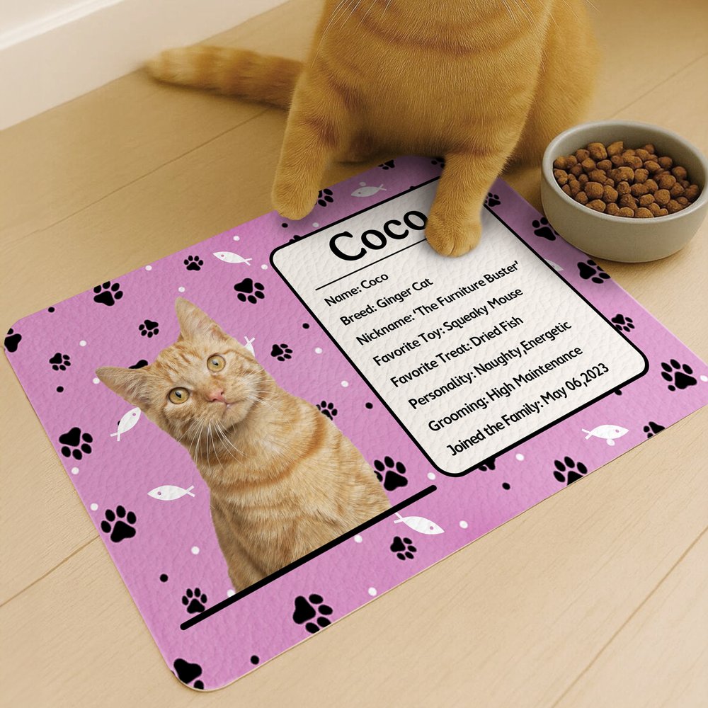 The overall design of this feeding mat is a pet's ID card. Not only can you upload photos of your pet, but you can also customize it from the aspects of name, breed, nickname, favorite toys, favorite food, personality, grooming and maintenance, joining time, etc., to introduce your favorite baby in all aspects. A variety of colours are available, and it is matched with paw prints and bone/small fish patterns to create a unique pet feeding mat to show the deep affection between you and your pet.