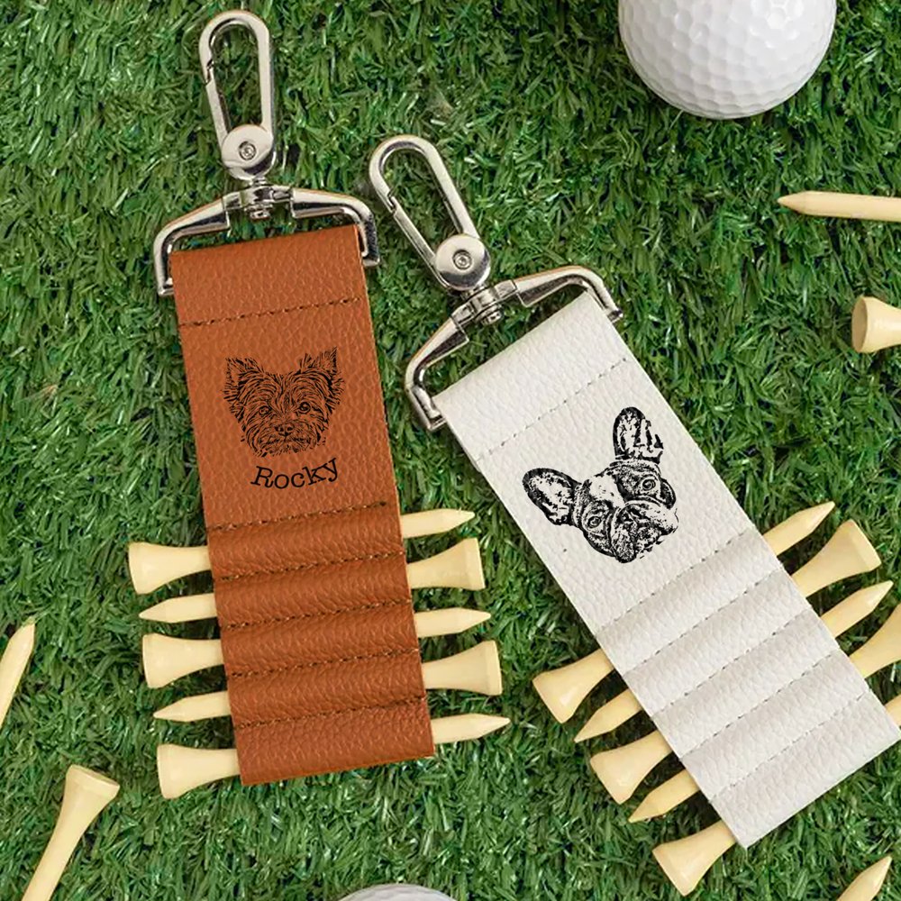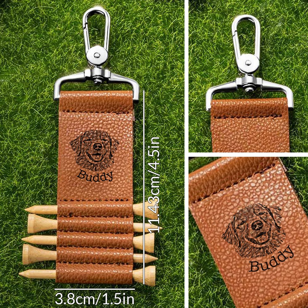 Personalized Pet Photo to Lines PU Leather Golf Tee Holder Bag Tag with Pet Name and 5 Pcs Bamboo Tees Golf Club Birthday Gift for Golf Players