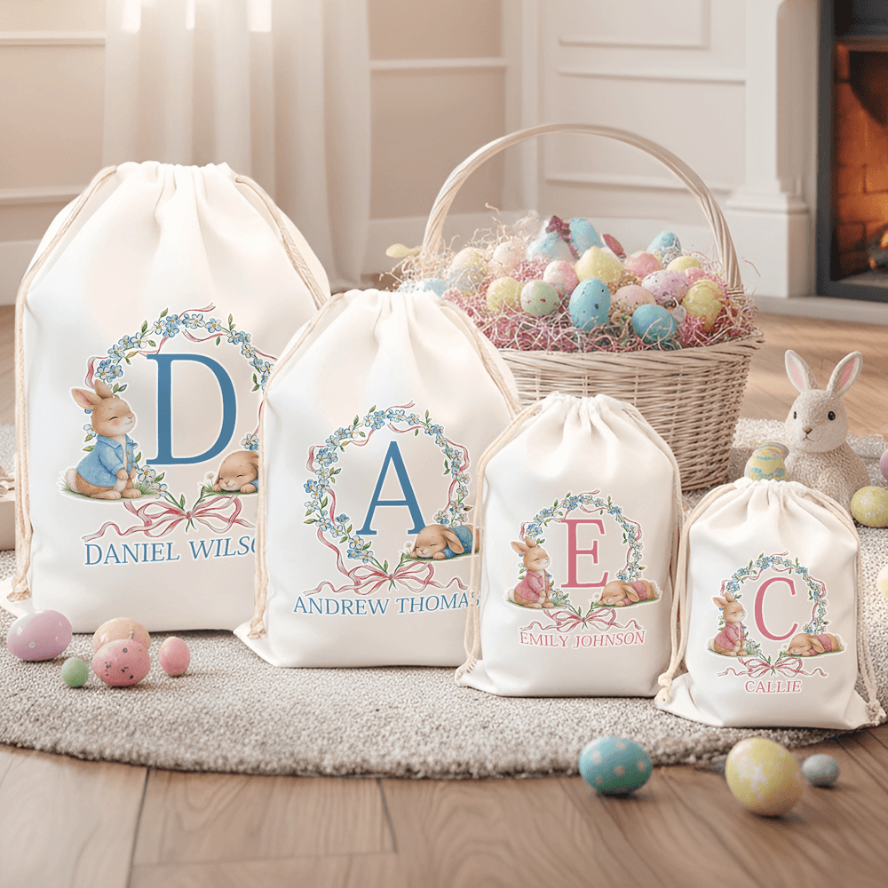 Personalized Peter Rabbit Bow Wreath Drawstring Canvas Gift Bag with Name and Initial Daily Storage Easter Gift for Boys Girls