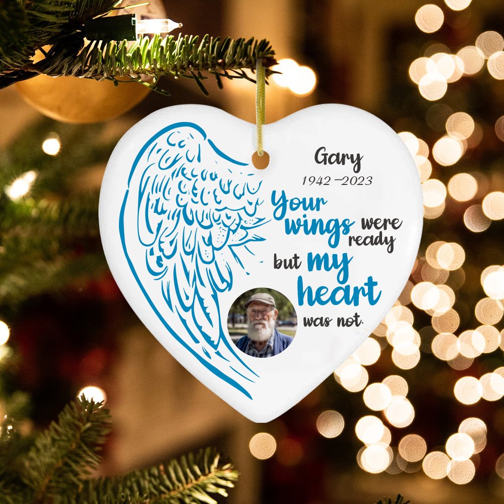 The beautiful angel wings are stamped with the name of the loved one the year of the memorial and the words "Your wings were ready, but my heart was not." Add a touch of love and remembrance to your holiday decorations with exquisite photo memorial ornament. This stunning ornament not only brightens up your Christmas tree but also serves as a beautiful tribute to your loved ones who have passed on.