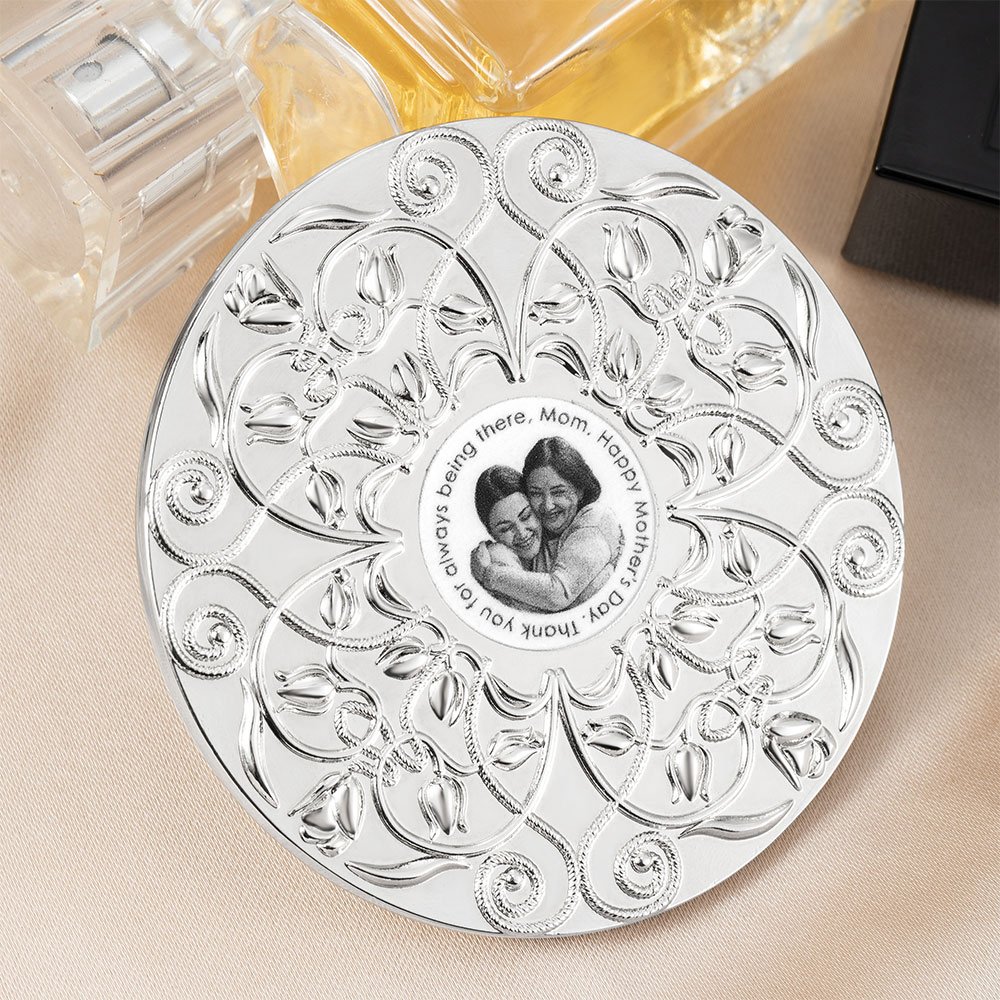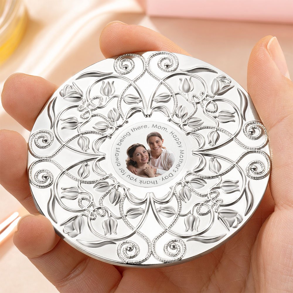 The makeup mirror is inspired by a garden. The back of the mirror features a tulips embossed design that has good symbolism. Meanwhile, the matching elegant lines add a premium texture to the mirror. The vintage pattern creates a sophisticated, small and meaningful makeup mirror.