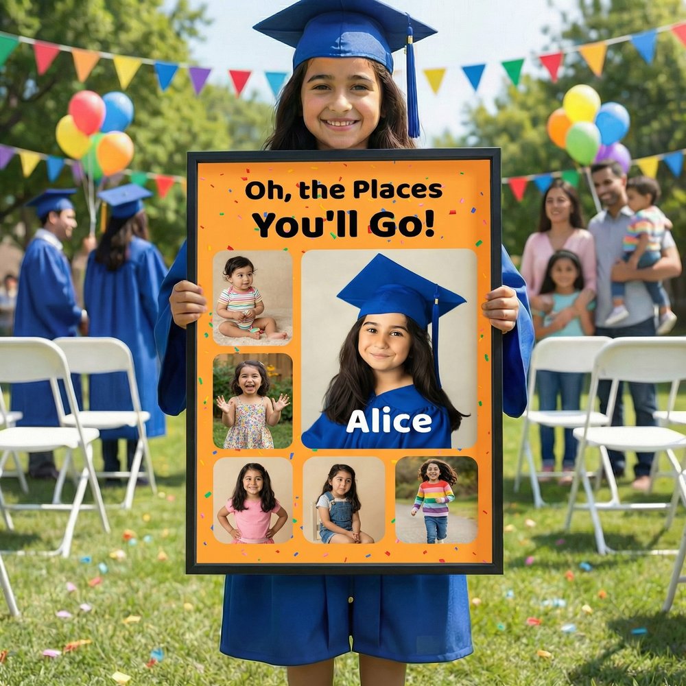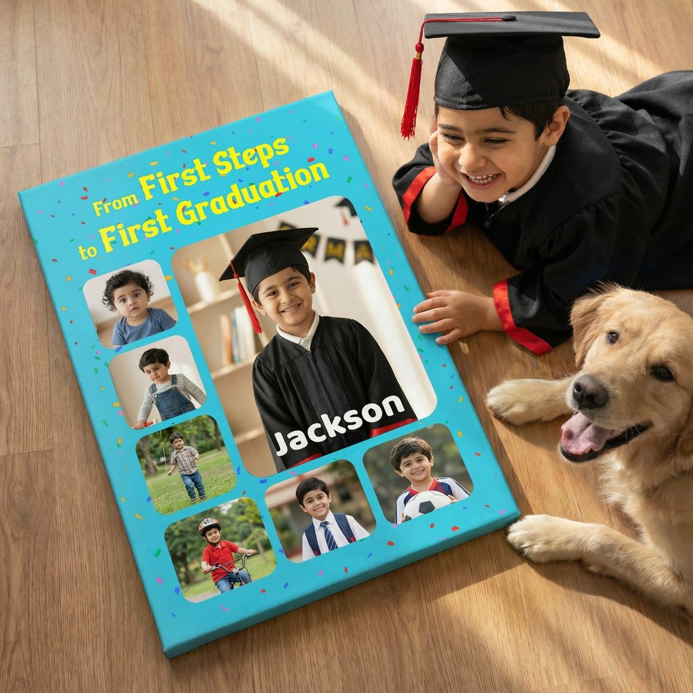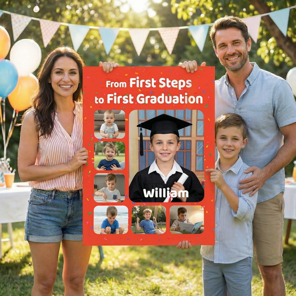 A meaningful keepsake for children, grandchildren, and young graduates to mark important growth milestones. This photo collage artwork collects precious childhood memories, conveying sincere blessings and heartfelt pride. It is a perfect present for milestone celebrations, growth commemorations, school events, and seasonal holiday gifting, wishing every young graduate a brilliant and promising new journey ahead.