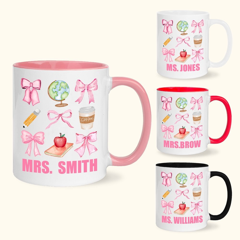 This mug features classic patterns such as a pink bow, pencil, coffee, globe, and apple. These elements beautifully represent teachers' nurturing and educational role, making it an ideal gift to express gratitude.