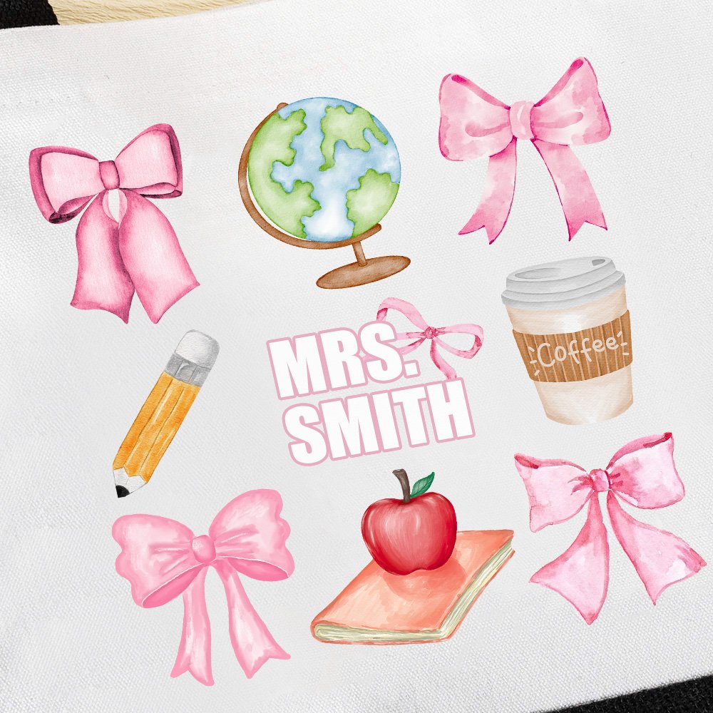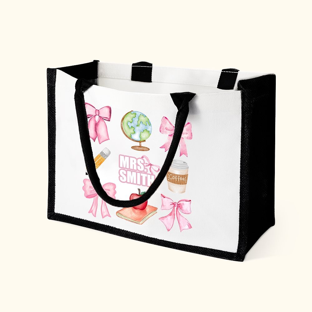 This canvas tote bag features classic patterns such as a pink bow, pencil, coffee, globe, and apple. These elements beautifully represent teachers' nurturing and educational role, making it an ideal gift to express gratitude.