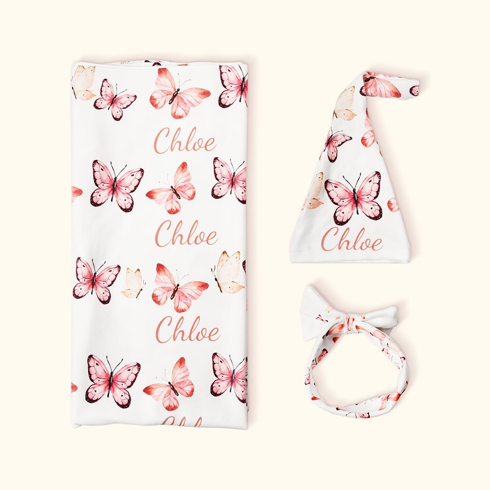 [BUTTERFLY BLISS]: The star of the show is the exquisite butterfly design that graces the blanket, swaddle, hat, and headband. These whimsical, fluttering butterflies are meticulously printed in a stunning pink shade, adding enchantment and femininity to the ensemble. The subtle shimmer and textured details bring the butterflies to life, creating a visually captivating look with everyone oohing and aahing over your baby girl.