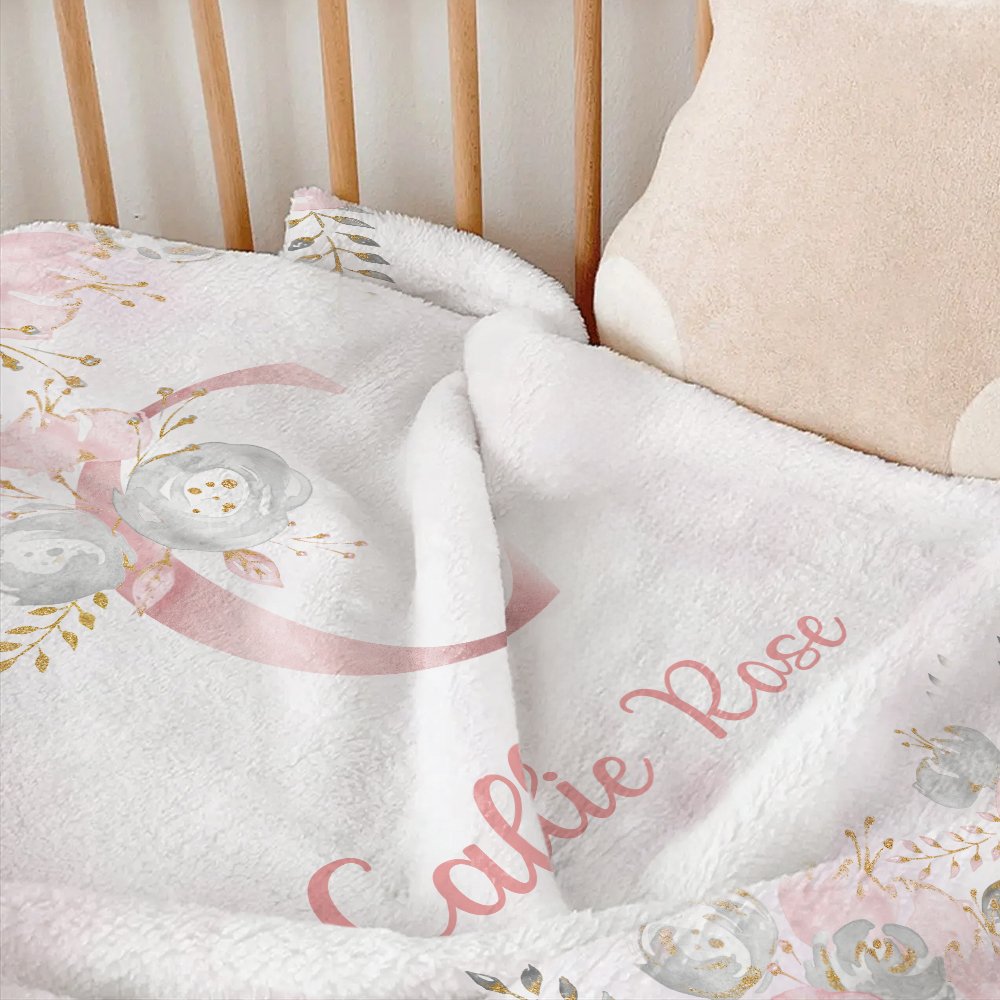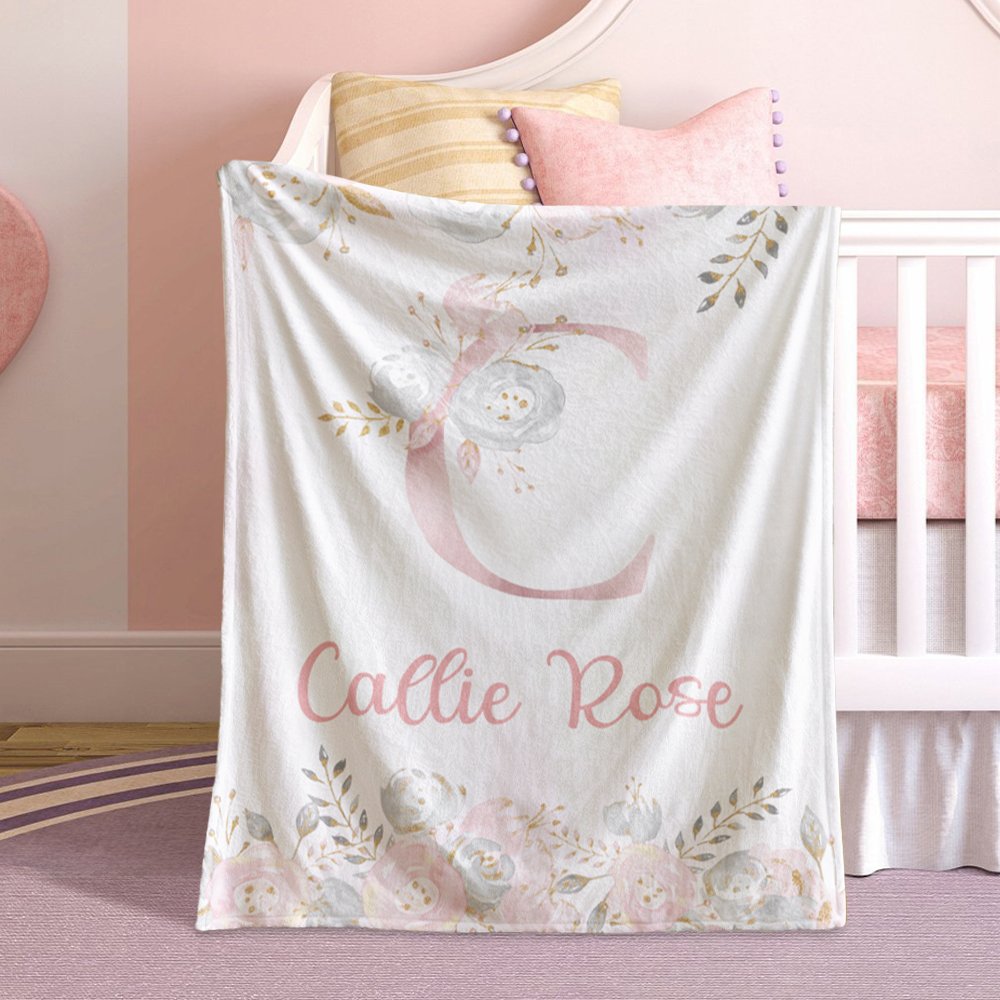 This delicate, soft baby blanket will delight you with its charming pink floral and initial design printed with your kid's name, bringing a unique style to your baby's nursery.
