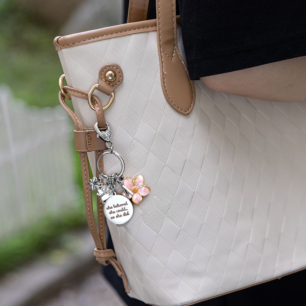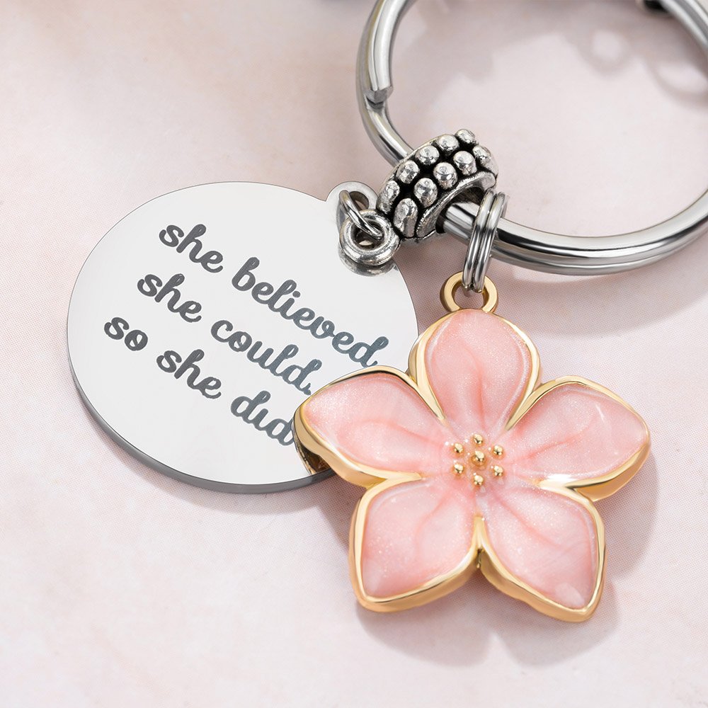 The design of our keychain is inspired by the annual graduation season, which is an important moment in our lives and a wonderful moment to witness and preserve. You can freely customize the year and initials, with lucky four-leaf clover, pink flower and graduation cap pendants, as well as the inspirational phrase "she believed she could...so she did" on the disc pendant to express your blessings to graduates.