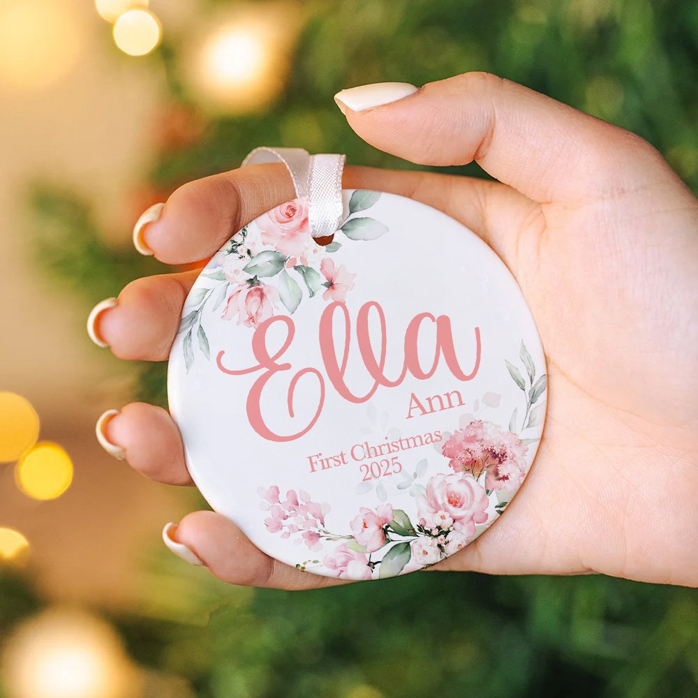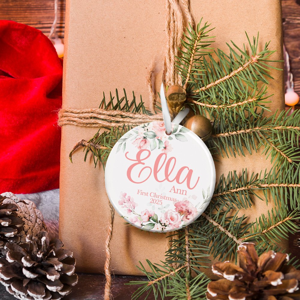 Featuring pink flowers and the phrase "First Christmas," this ornament adds a touch of warmth and elegance to your holiday decor. It’s designed to capture the joy and love of new beginnings.