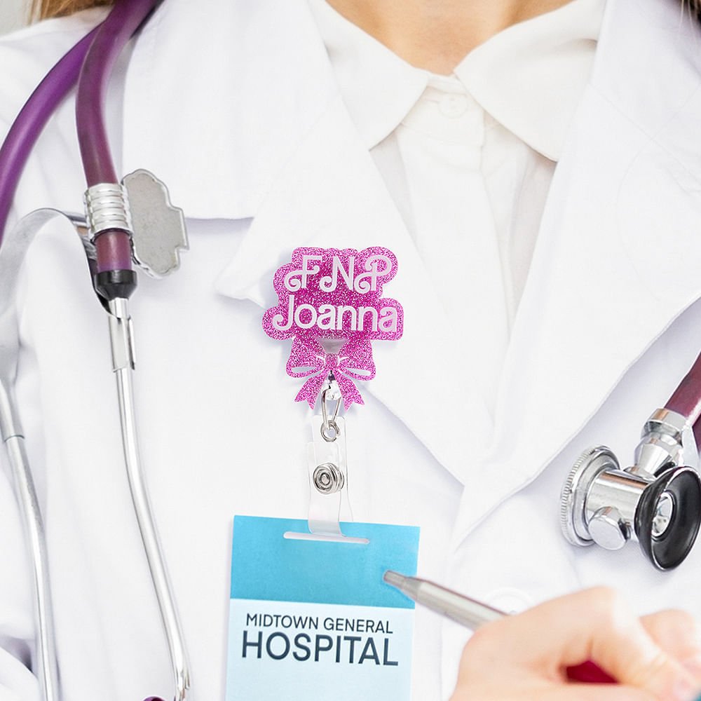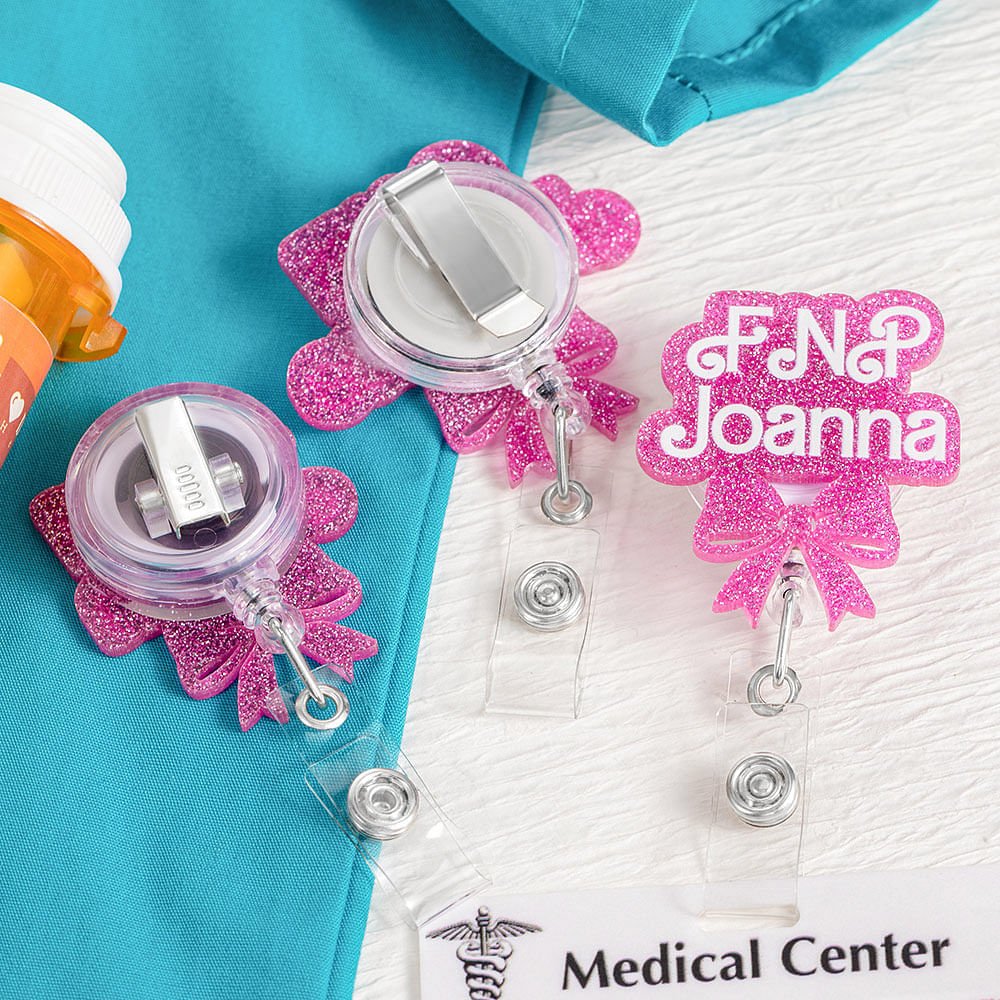 We have carefully designed a Personalized glitter pink bow knot nurse badge reel. You can also customize the title and name, making identity authentication more convenient and efficient. A perfect way to display your identity or credentials at work at a glance.