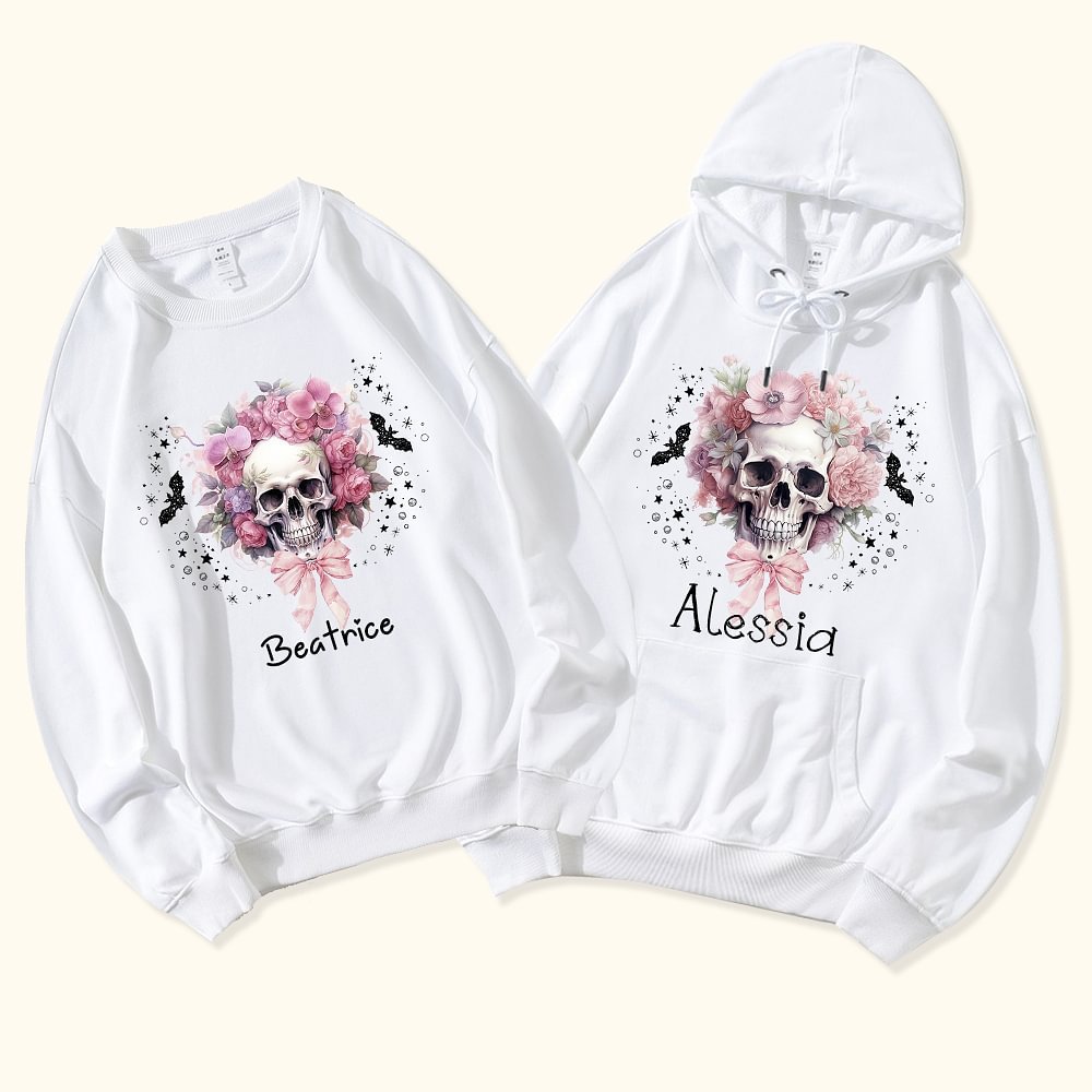 This Personalised pink skull flower sweatshirt or hoodie uses a customized service to make your name come alive on the clothes, with a skull and gorgeous pink flower pattern that is mysterious and sweet.