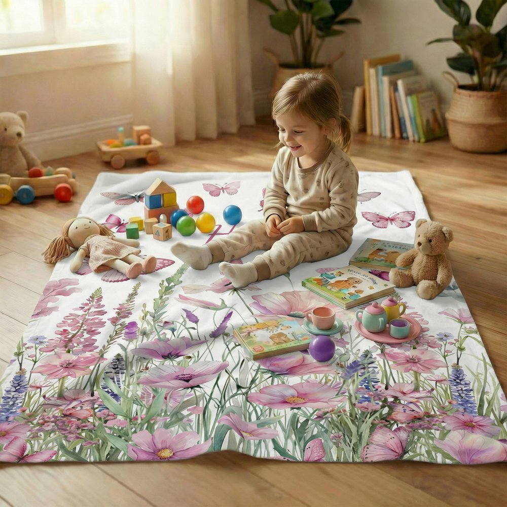 Its soft white base features a watercolour border of pink and purple wildflowers, with delicate butterflies fluttering above. The custom name is printed in a gentle pink font at the centre, creating a cohesive, whimsical look that feels like a watercolour painting come to life. The design blends nature-inspired charm with personalization, resulting in a blanket that’s both cozy and full of magical warmth.