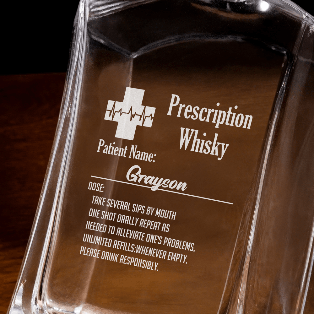 Our whisky decanter features a design centreed around the concept of "prescription whisky," allowing you to savor your favorite spirits as a remedy for life's troubles. You can choose to engrave the name of your preferred whisky, specific text, and names on the decanter, making each piece truly one-of-a-kind. This personalized design not only reflects your thoughtfulness but also adds sentimental value, transforming the gift into a cherished keepsake.