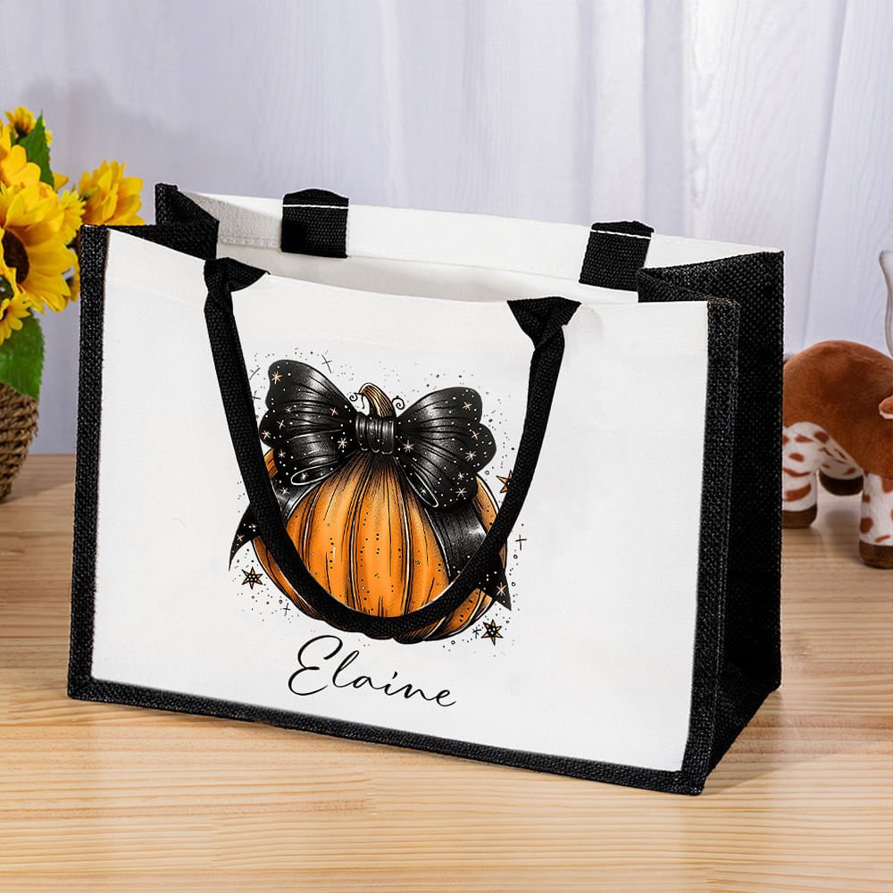 This tote bag features a fun and festive pumpkin bow design, perfect for Halloween lovers. With the customizable name, it becomes a unique and personal accessory, adding to the excitement of the spooky season.