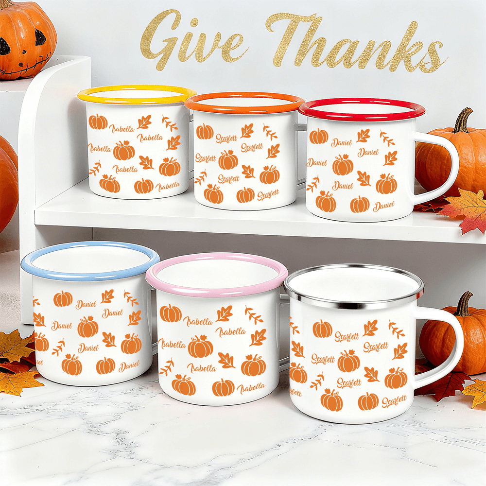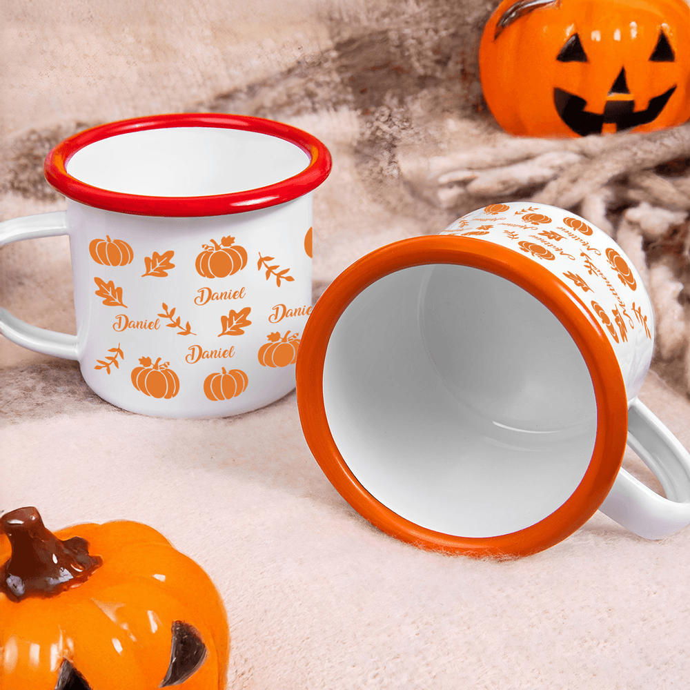 Adorned with pumpkin and maple leaf motifs, this enamel mug captures the essence of autumn and Thanksgiving. Customize it with a name and choose from a selection of seasonal colours to create a one-of-a-kind piece brimming with personal charm.