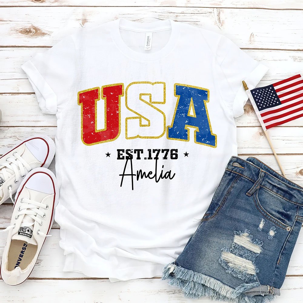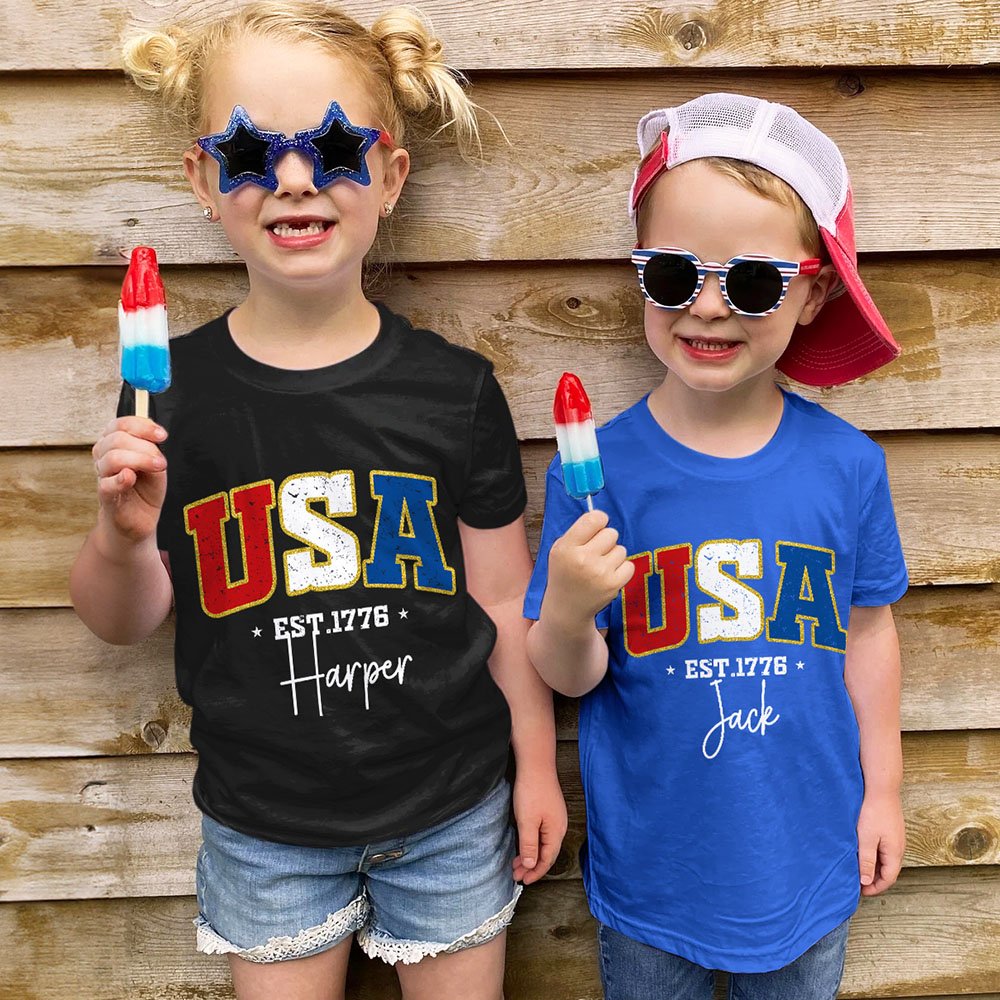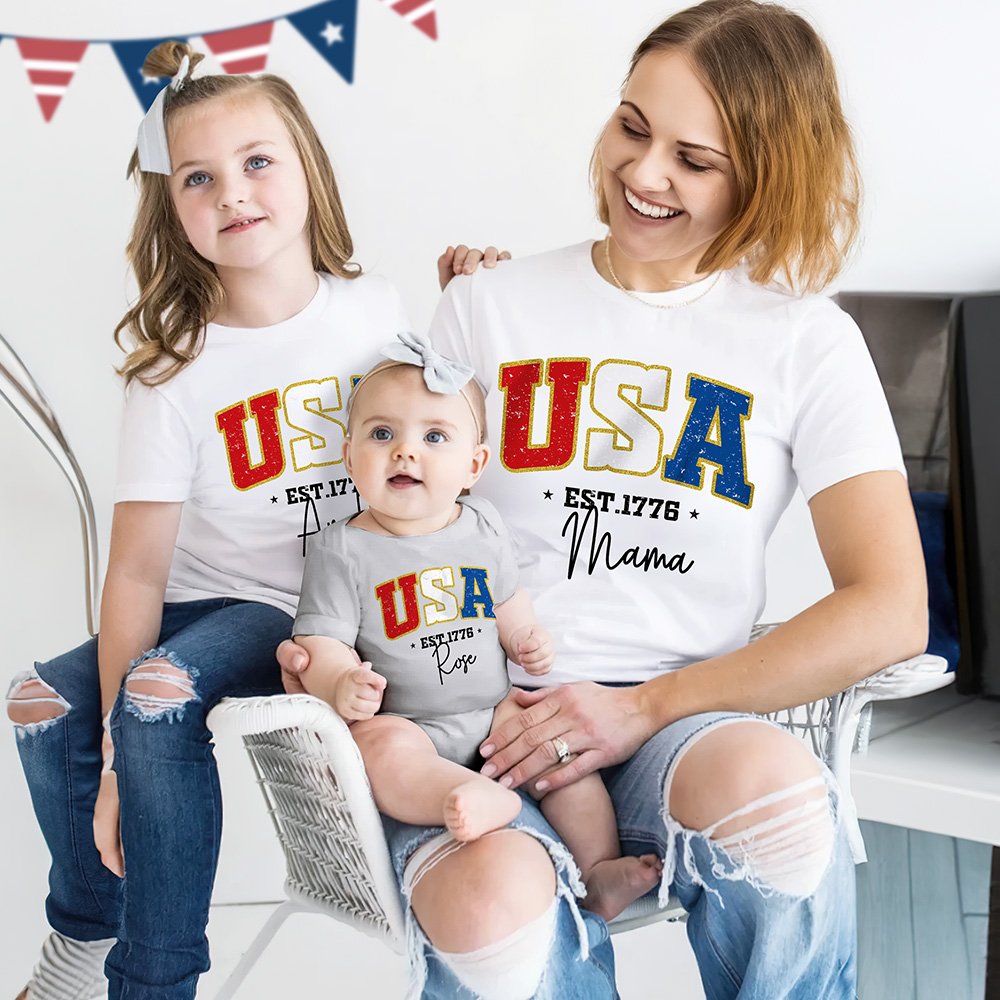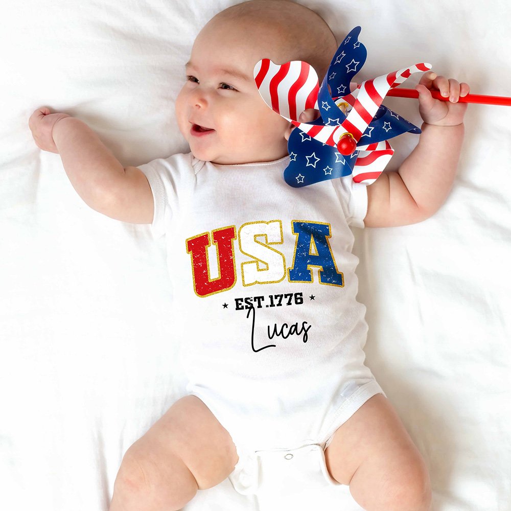 Celebrate the spirit of Independence Day with special clothes, which feature USA font designed with the colours of the American flag—red, white, and blue, capturing the essence of national pride and festivity. A custom name adds a touch of personality.