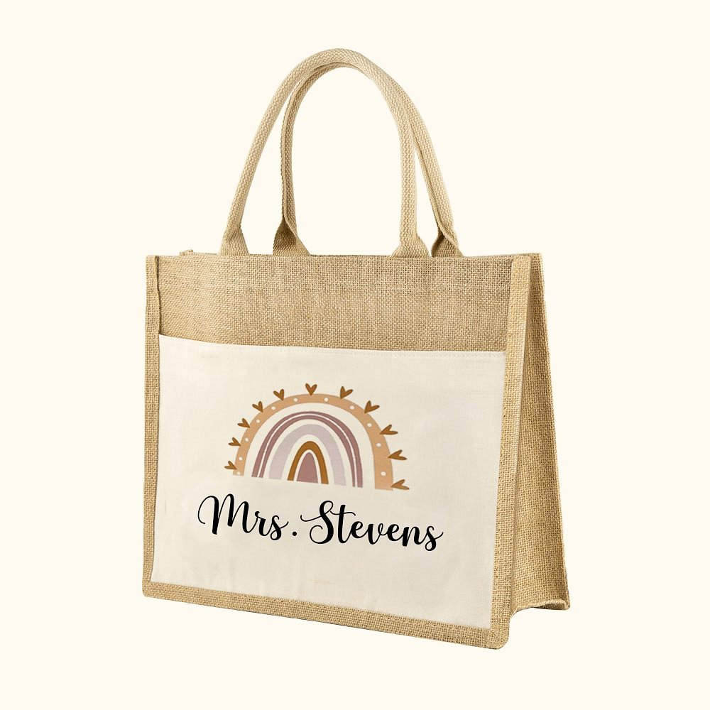 This jute tote bag features a vibrant array of six distinct rainbow designs, adding a cheerful and eye-catching touch to everyday carry. The versatile design allows for the personalization of the bag with a teacher's name, transforming it into a truly unique and thoughtful gift.