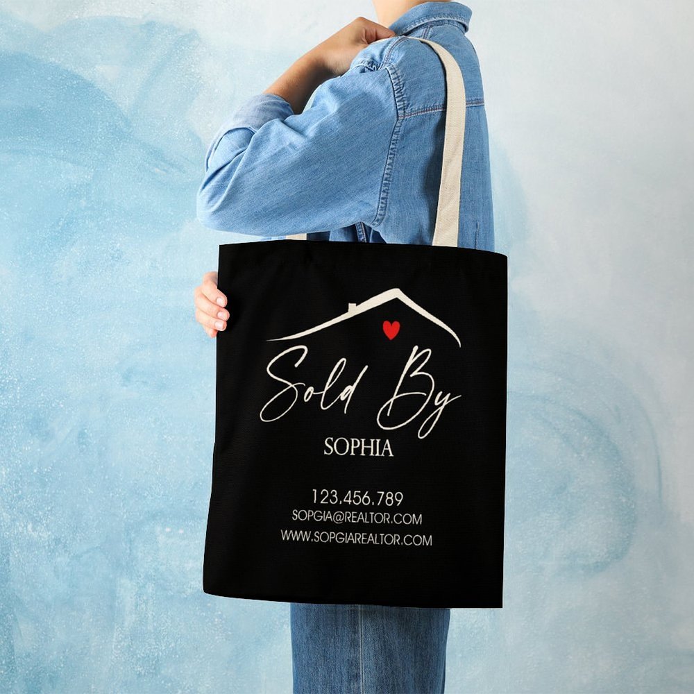 Our Personalized realtor tote bag is a practical and stylish business gift for estate agents. It features a unique design with a roof and heart symbol, representing the real estate profession and a commitment to client care. The bag can be customized with your name, phone number, email address, and website, making it a powerful marketing tool.