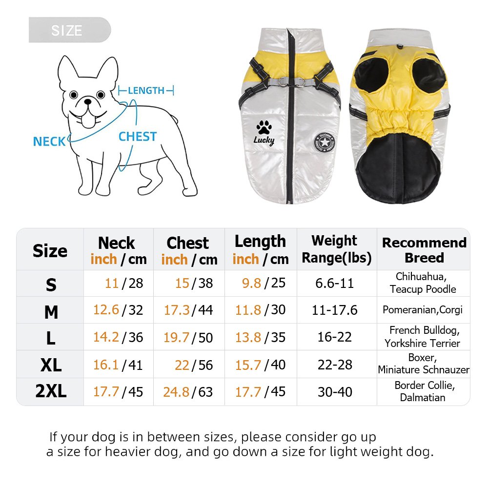 The dog winter jacket is designed to fit every dog, from puppies to large breeds. Available in sizes ranging from small to 2XL, it's perfect for breeds like Chihuahua, Yorkie, Poodle, Bulldog, Schnauzer, Border Collie, and more. This stylish dog jacket is engineered to keep your furry friend warm, cozy, and fashionable on chilly days.
