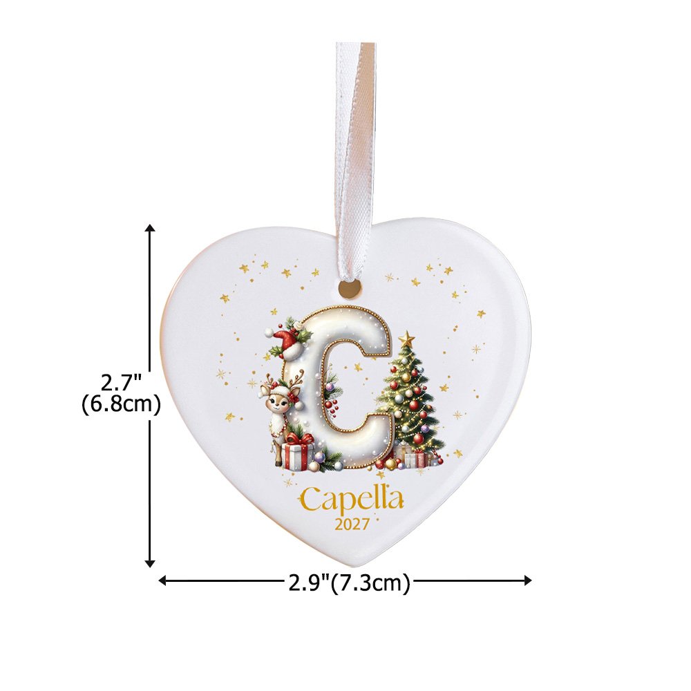 This beautifully crafted ceramic ornament features the festive Christmas initial adorned with cute reindeer and a Christmas tree, you can customize it with your name and year, making this ornament a meaningful representation of the holiday season.