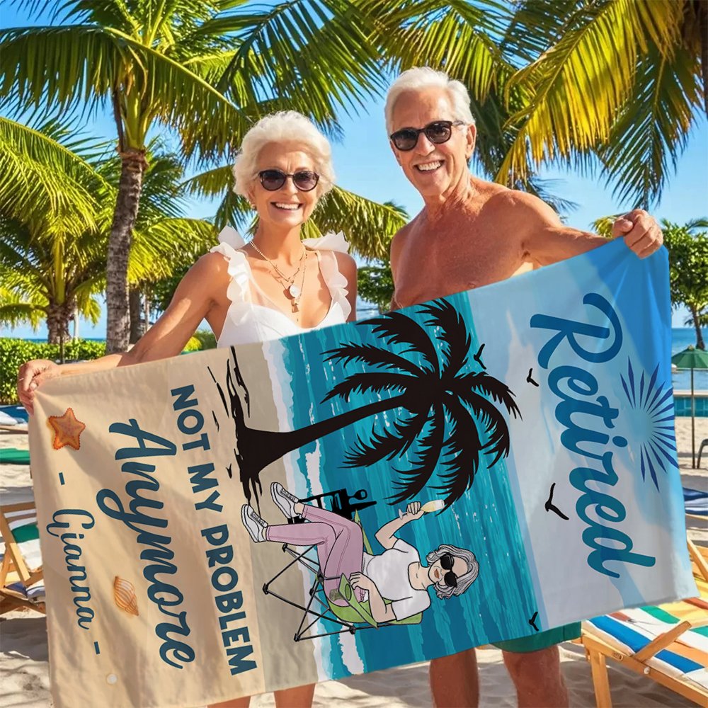 This beach towel features a beach vacation theme, with the cartoon character enjoying a relaxing moment under a coconut tree, showcasing the joys of retirement. The playful slogan, "Retired Not My Problem Anymore," perfectly captures the carefree attitude of retirement. Customizable names make this beach towel unique, creating a truly special summer accessory.
