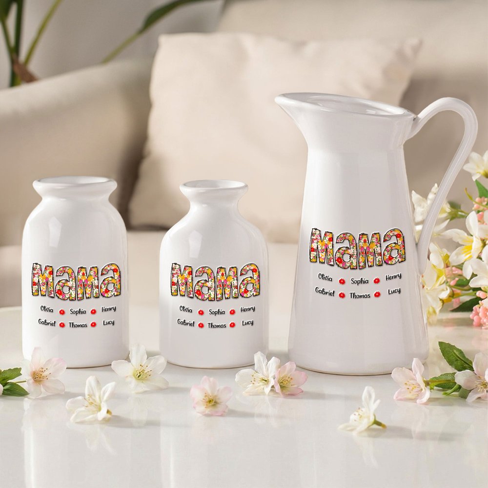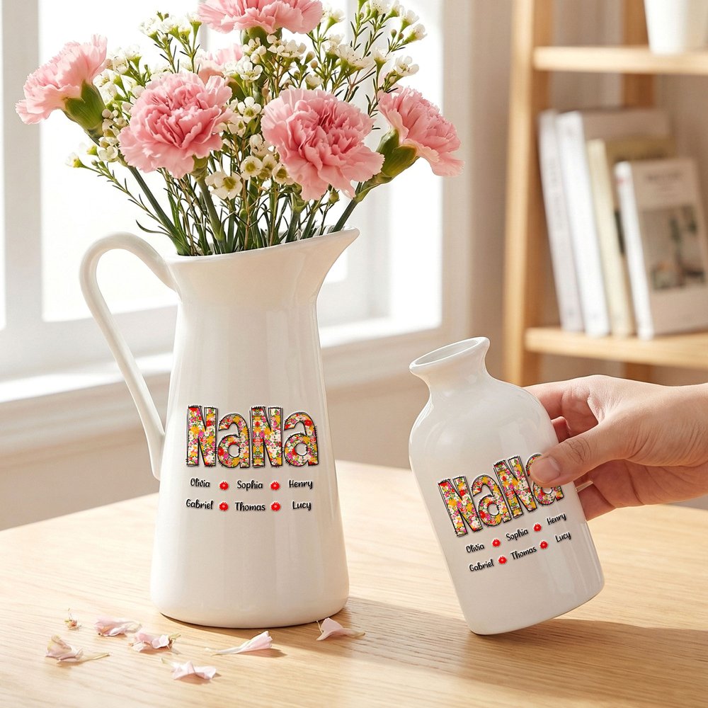 Centreed on a floral aesthetic, this vase integrates soft, delicate flower textures into its lettering, exuding a timeless, soothing charm. Fully customizable, it lets you print a beloved senior’s title (such as Nana, Gigi, Mom, or Mama) alongside the names of multiple kids, turning an ordinary vase into a heartfelt, one-of-a-kind keepsake brimming with family love and cherished memories.