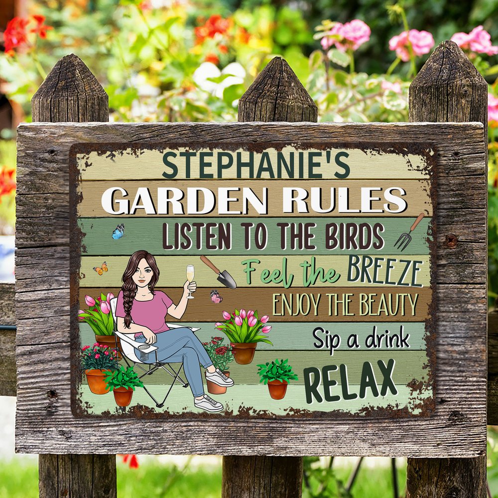 This vintage-style garden sign features a "GARDEN RULES" theme with a customized cartoon character enjoying a relaxed atmosphere. Adorned with gardening motifs—including flowers, potted plants, and tools—it brings the charm of a well-tended garden to any space. Personalise it by adding your name at the top for a distinctive touch.