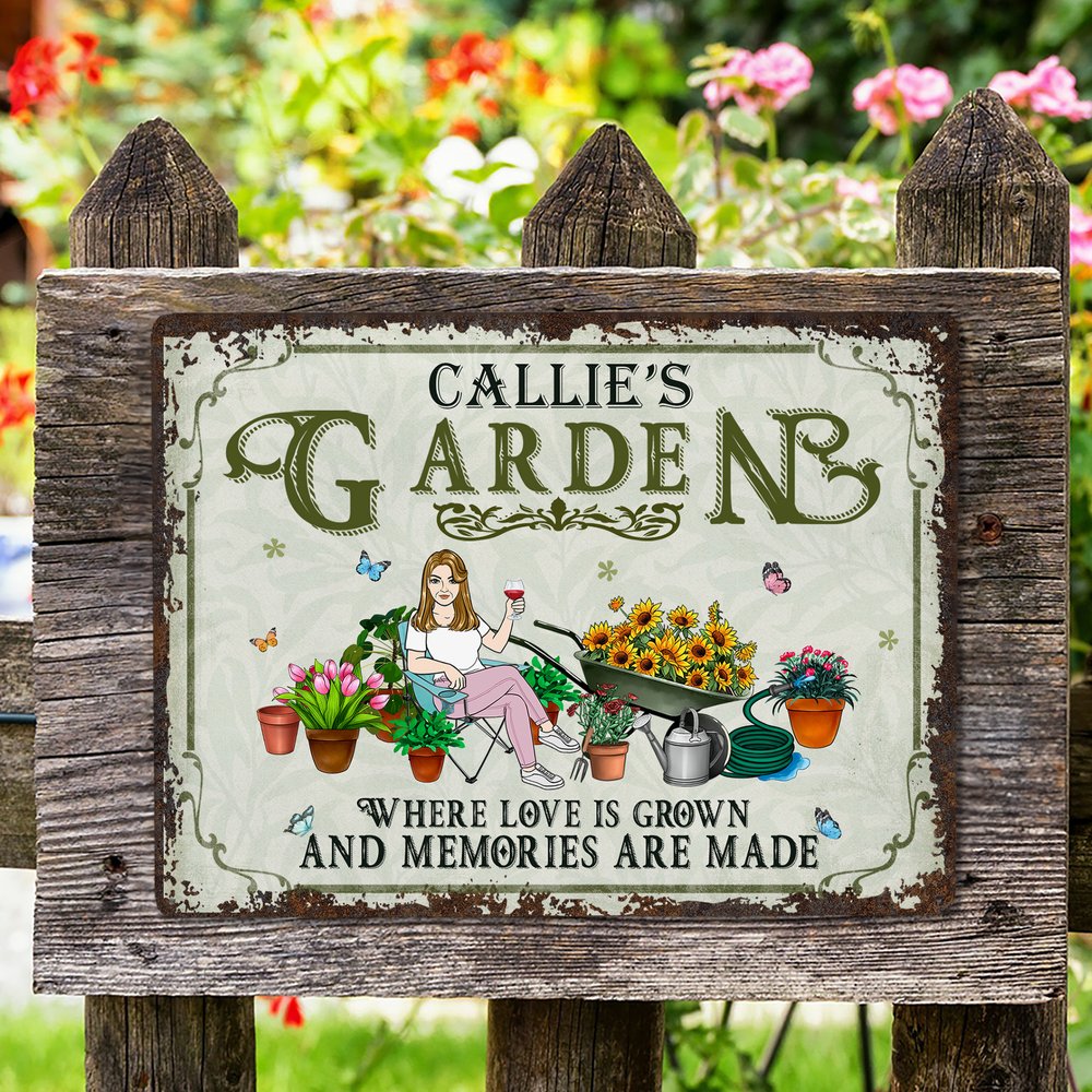This metal sign combines a flower cart, a flower pot, a kettle, and a vintage cartoon character sitting leisurely sipping a drink, with the words “where love is grown and memories are made” printed on the bottom as if entering a beautiful and quiet backyard garden. Each sign can be customized with a name and character shape, and the retro color palette with the lively painting style is nostalgic and fun at the same time.