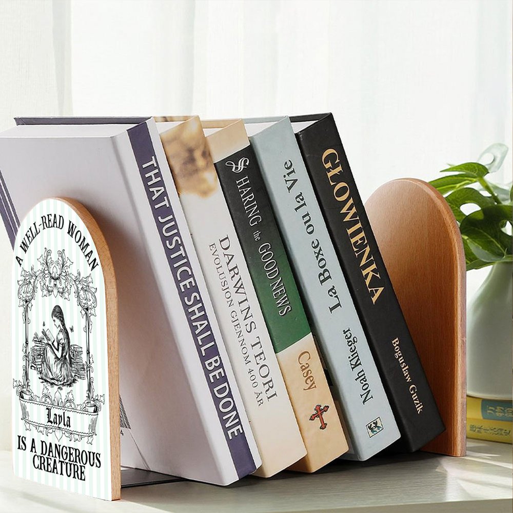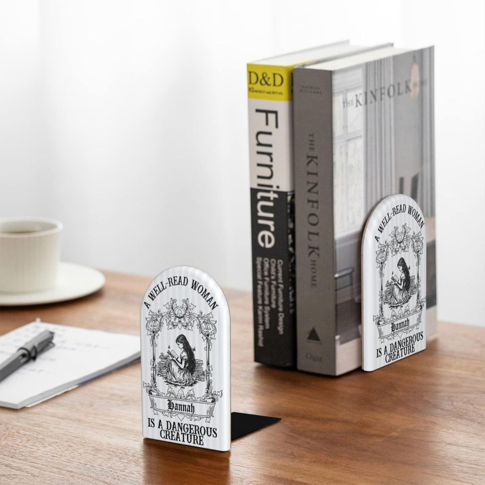 This unique bookend features a vintage hand-painted illustration of a woman engrossed in reading. You can customize her hairstyle and add a name, making it one-of-a-kind. The humorous slogan “A well-read woman is a dangerous creature” brings a whimsical touch to any space.