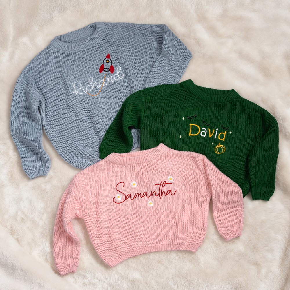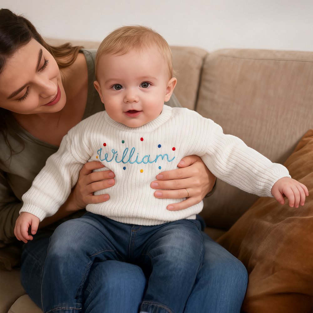 Customize this sweater with your baby’s name and choose from 9 playful embroidery motifs—from rockets and flowers to fish and hearts. Each design is carefully hand-stitched to create a dimensional, lively look, making every piece a unique celebration of your little one’s growth.