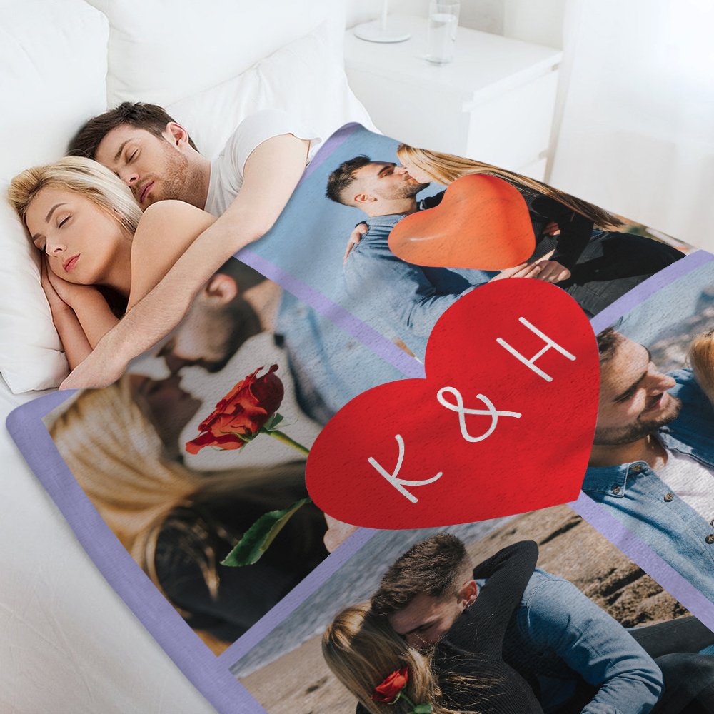 Personalized Romantic Heart Collage Photos Soft Warm Throw Blanket with Initials and Year Anniversary Birthday Christmas Gift for Couple