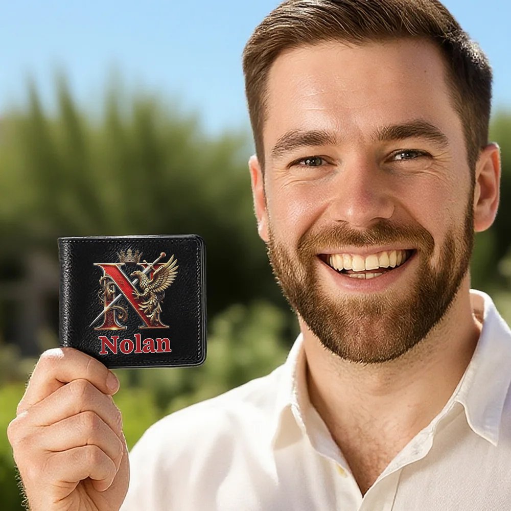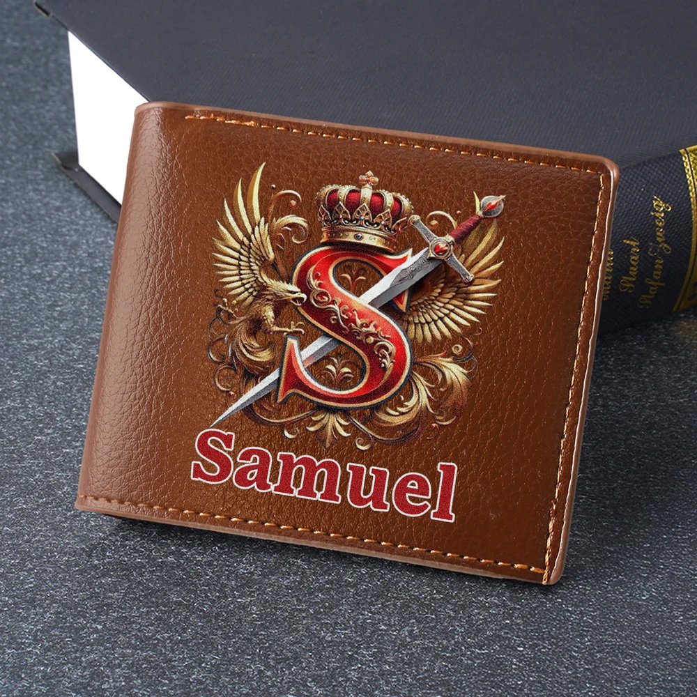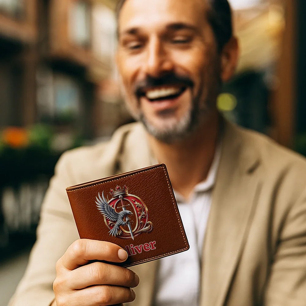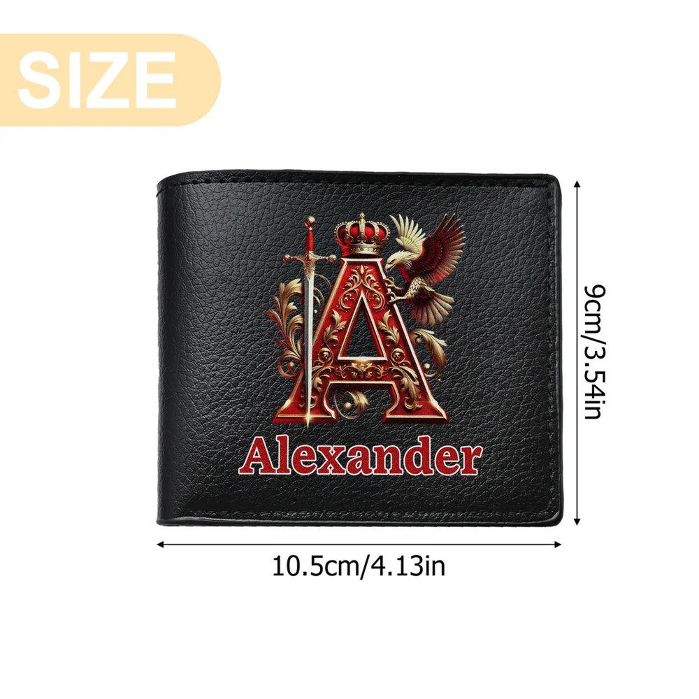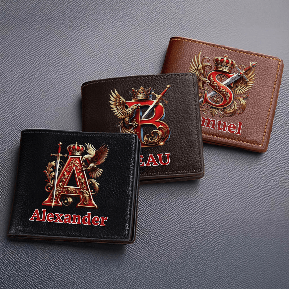 The wallet features a custom initials design on the front, incorporating elements such as an eagle, sword, and crown. The contrasting gold and red colours exude a regal and timeless elegance. It can also be customized with your name, creating a unique personal item.