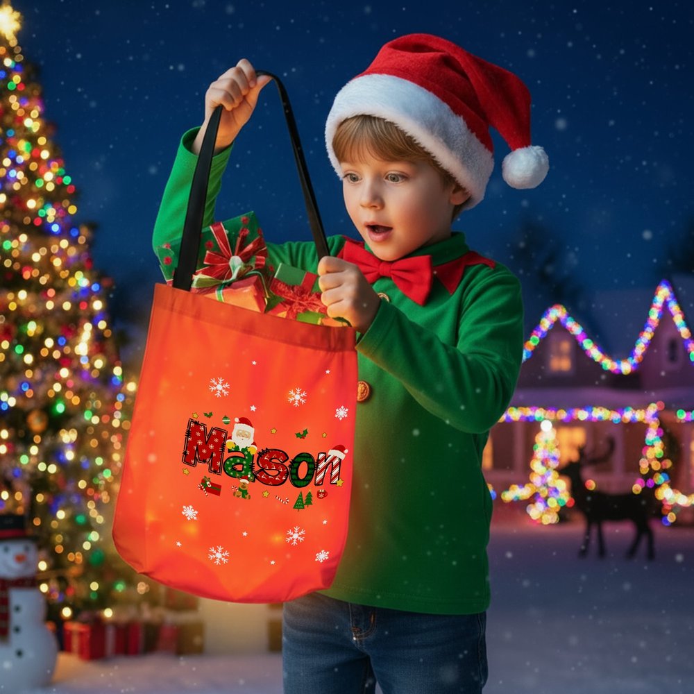 Featuring a joyful Christmas print with Santa, trees, and snowflakes, this bucket bag can be customized with a child's name. Integrated LED lights add a magical glow, making each bag a unique and enchanting holiday accessory that sparks excitement and delight.