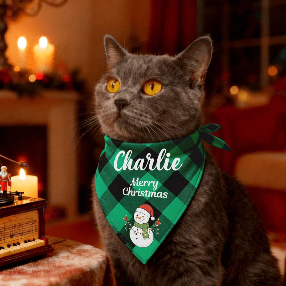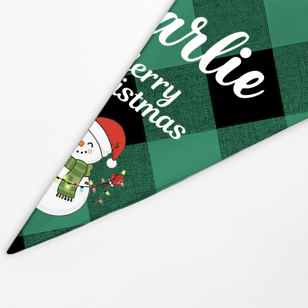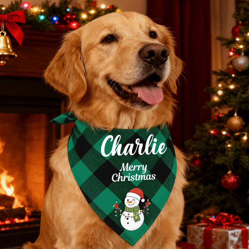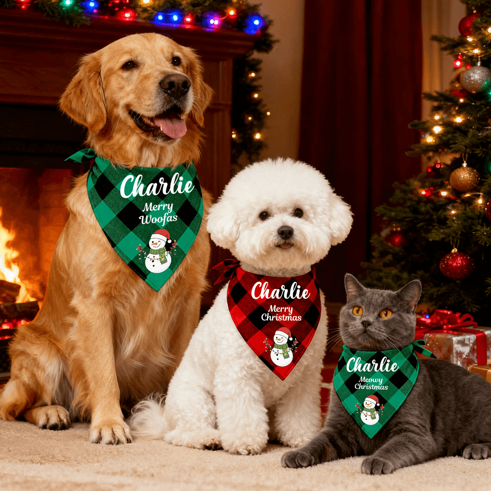 Featuring Santa Claus, snowmen, and classic plaid patterns with "Merry Christmas" greetings, this pet bandana can be personalized with your pet's name. Its festive design brings extra charm to your furry friend during the holiday season, making them the cutest companion.