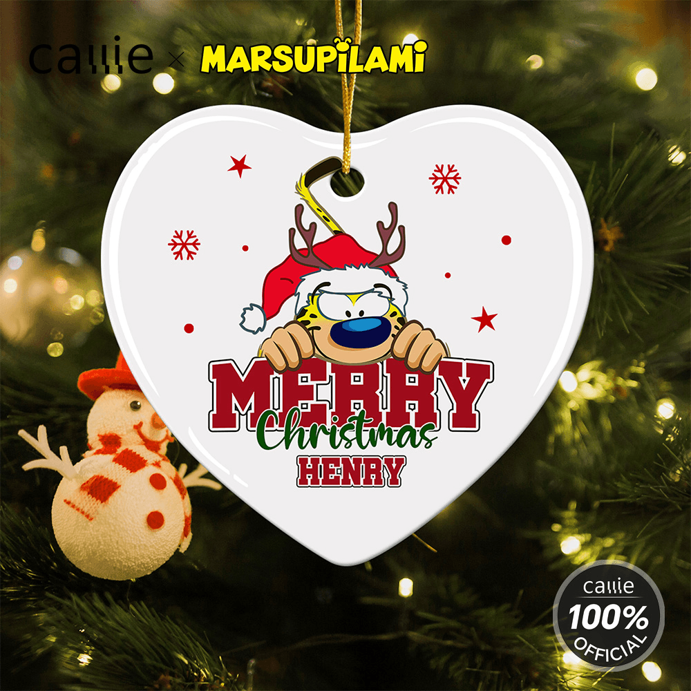 This Christmas ornament stands out with its heart-shaped design, featuring the long-tailed leopard Masupilami—a cartoon character created by Belgian illustrator André Franquin in 1952—blended seamlessly with festive elements to evoke a strong holiday spirit. Masupilami wears a Santa hat paired with reindeer antlers, its lively expression breaking the static feel of traditional decorations. Accented with "MERRY Christmas" lettering, snowflakes, stars, and a custom name, the ornament captures the festive atmosphere perfectly, adding a dynamic, childlike joy to any decorative setting.