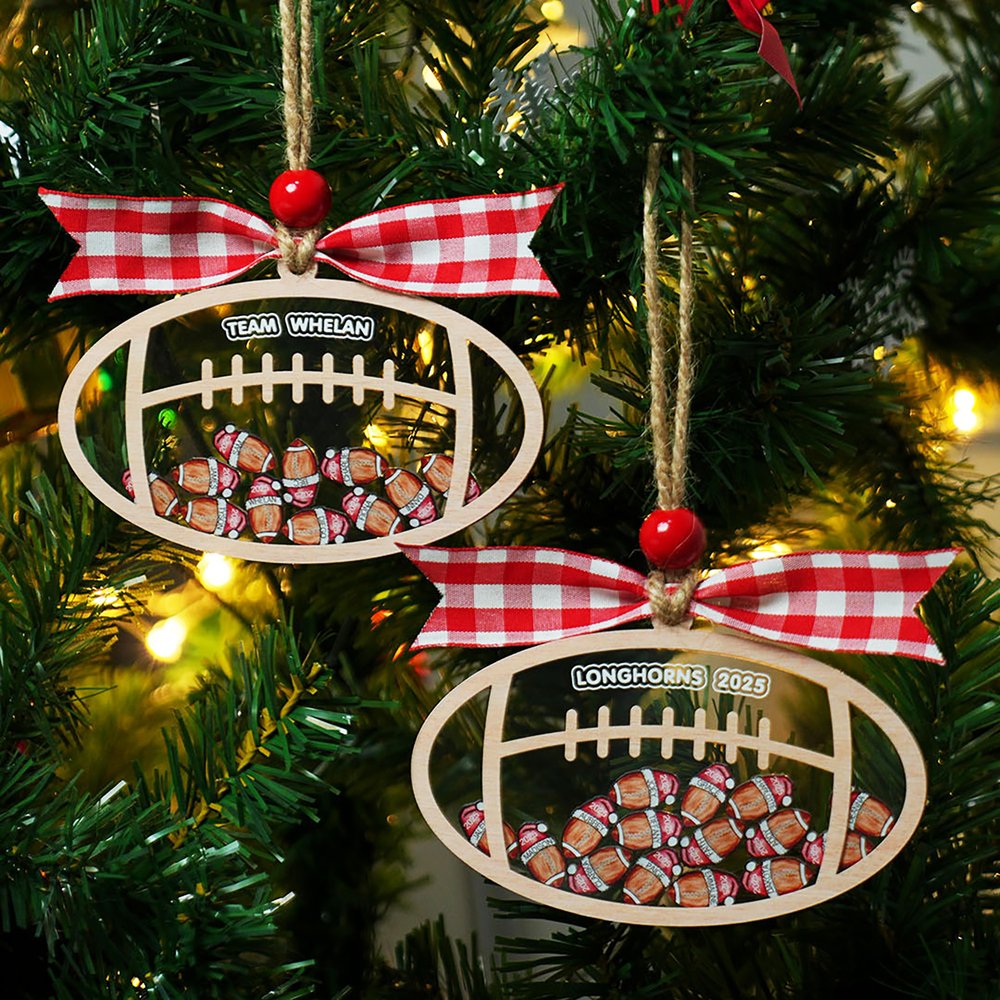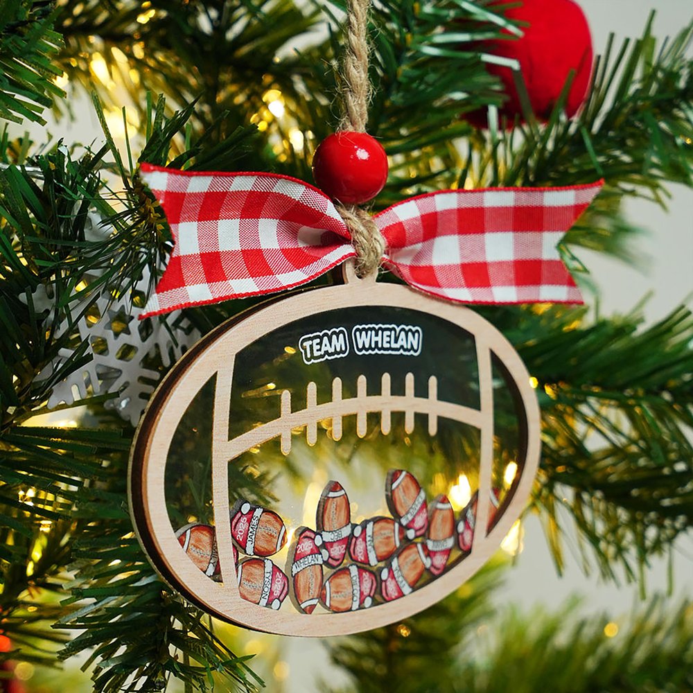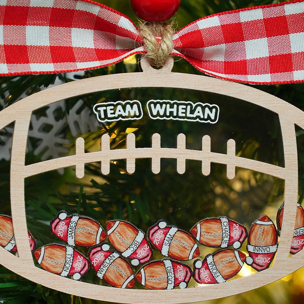 This Christmas shaker ornament features football-shaped acrylic pieces with Santa hats, each shaker representing a team member. Customize with your team name and player names—a perfect blend of holiday spirit and football passion.