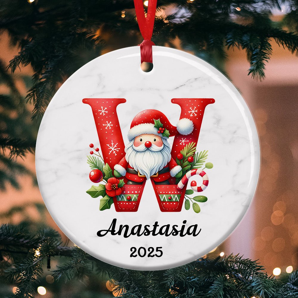 This ornament captures the essence of the holiday season with a classic Christmas theme. This elegant charm can be customized with a name or initials, making it a unique and thoughtful gift. Santa Claus graphics add a cheerful touch and symbolize Christmas's celebratory spirit, making it a special keepsake for family, friends, and children.