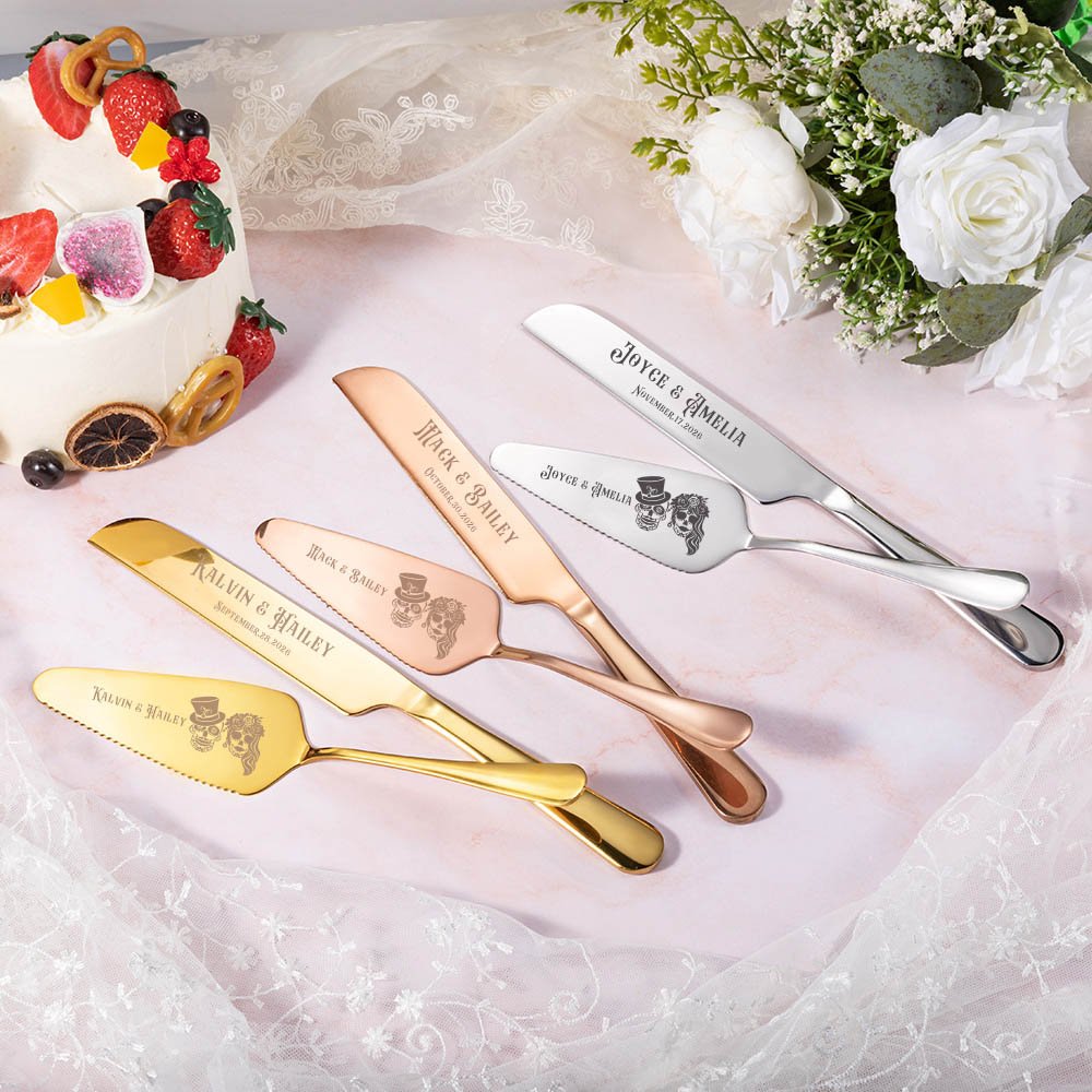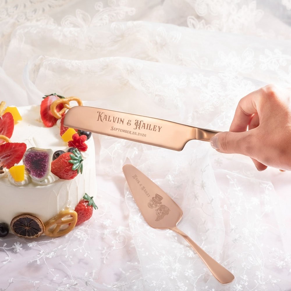 What makes this cake-cutting set truly special is the option to engrave the couple's names and dates onto the surface. This personalization adds a heartfelt feel, transforming the set into a cherished keepsake that will forever commemorate their special day.