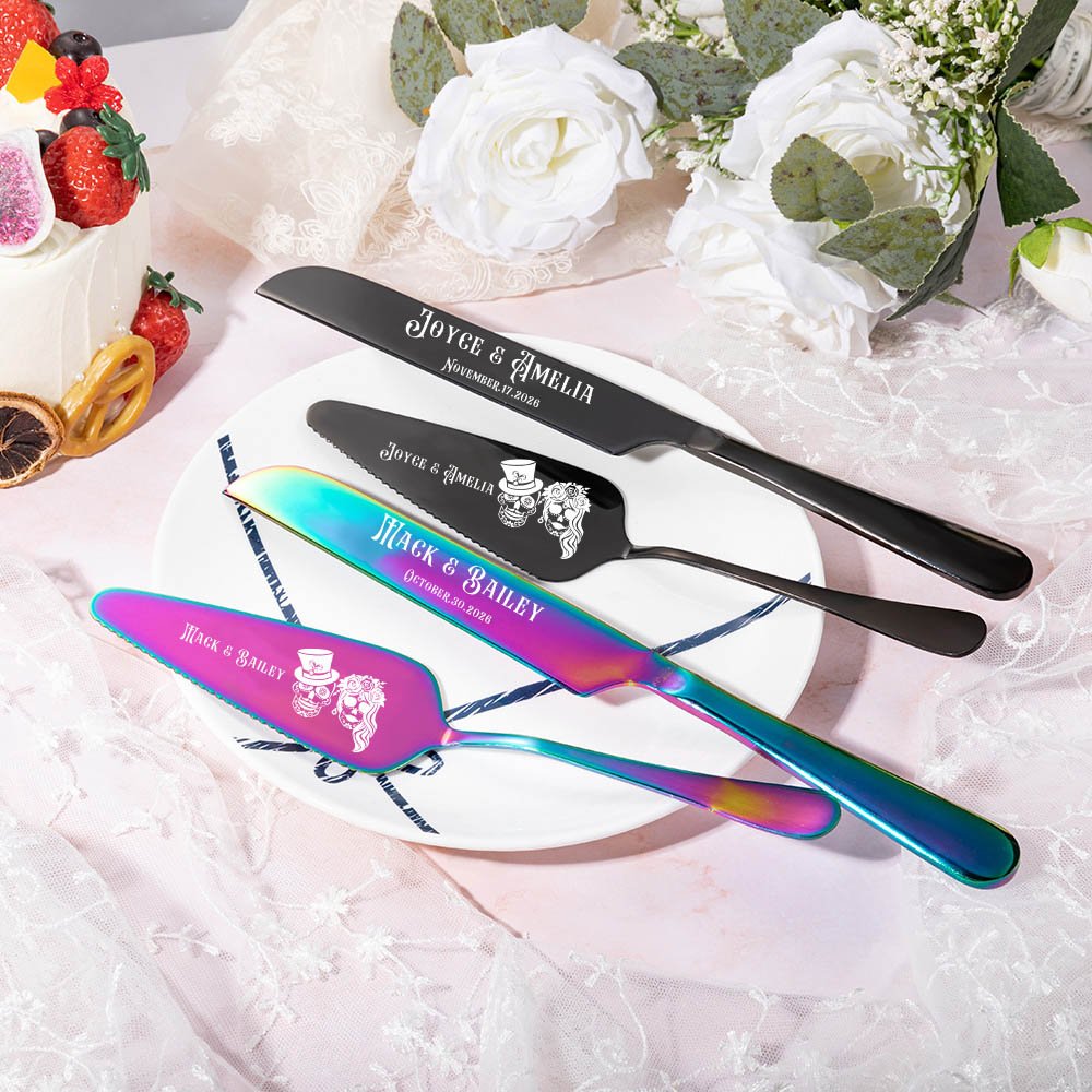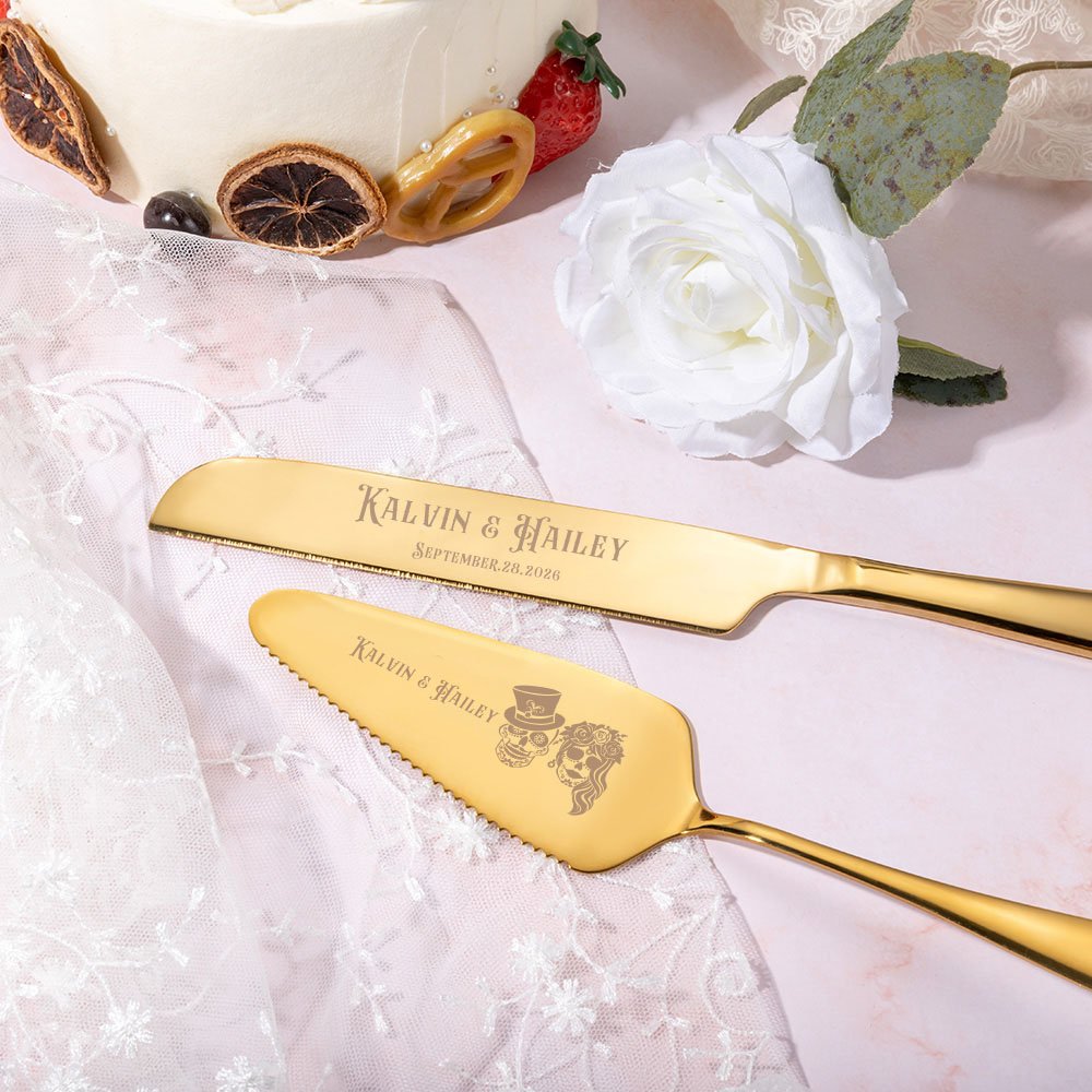 The stainless steel blades of the knife and server feature a sleek and polished finish, while the surface is adorned with a delicate and intricate Mr. And Mrs. Skull design. The set exudes sophistication, making it the perfect addition to any tableware collection.