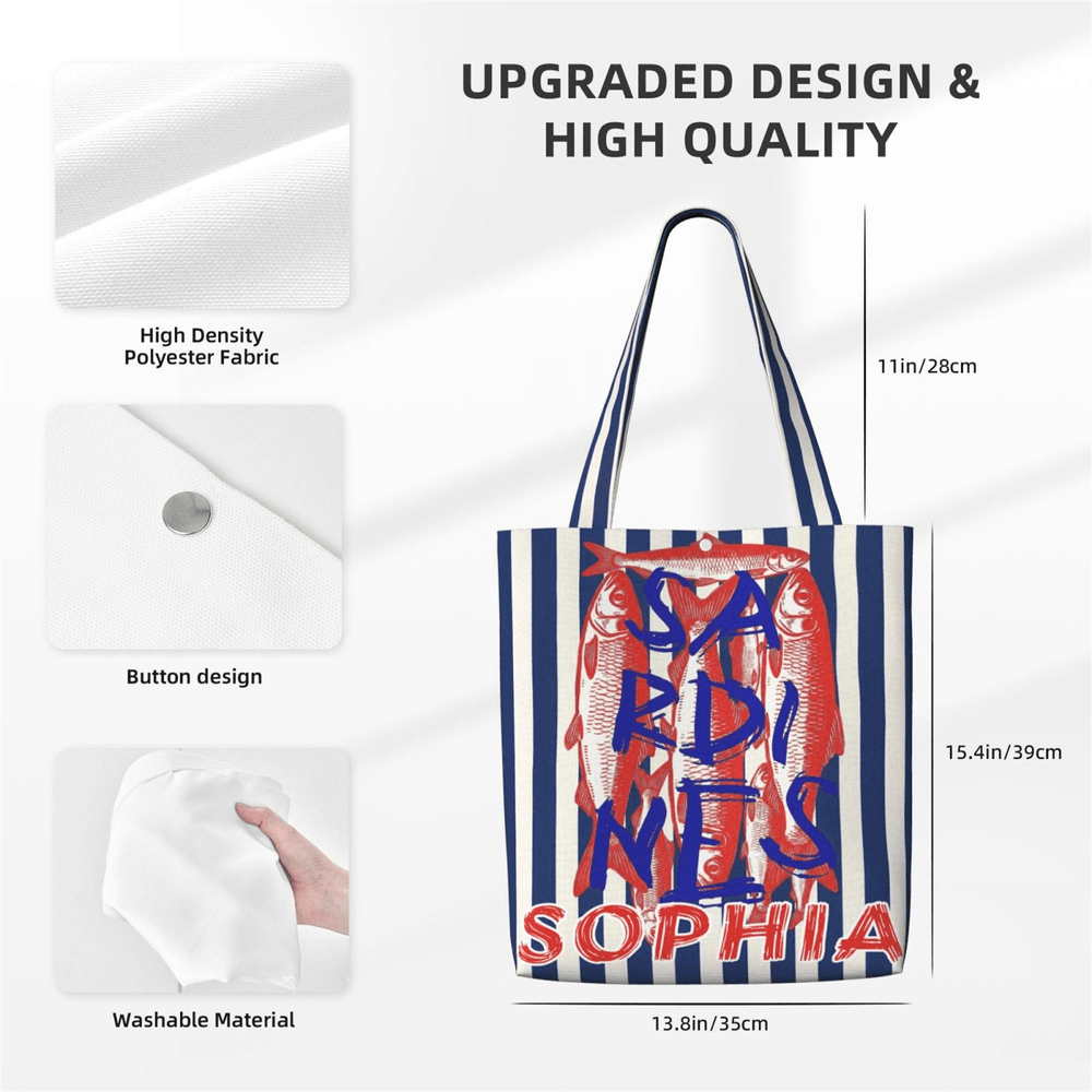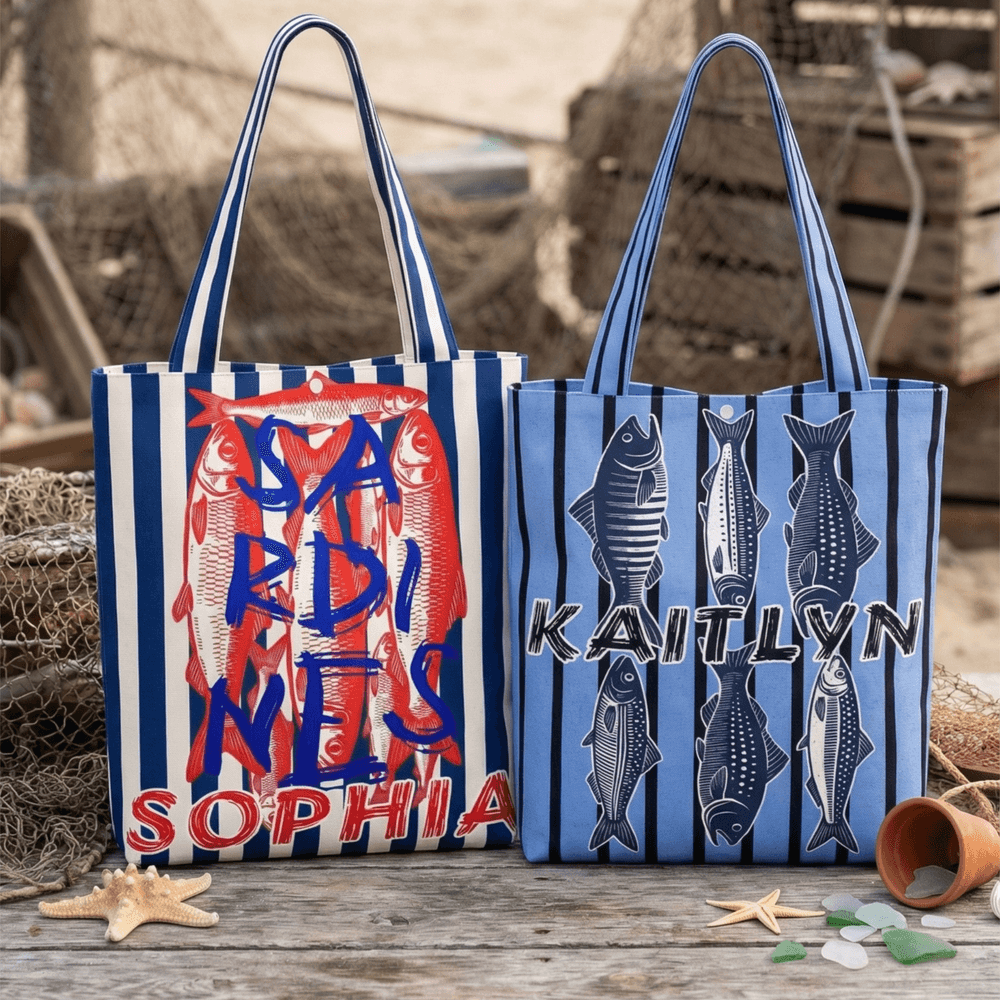 Featuring a creative ocean-style fish school pattern, it uniquely combines sardine, mackerel, and flounder, paired with a retro vertical stripe background for high recognition. Supports personalized name customization, making each tote bag a one-of-a-kind ocean-themed item that stands out with personality and daily charm.