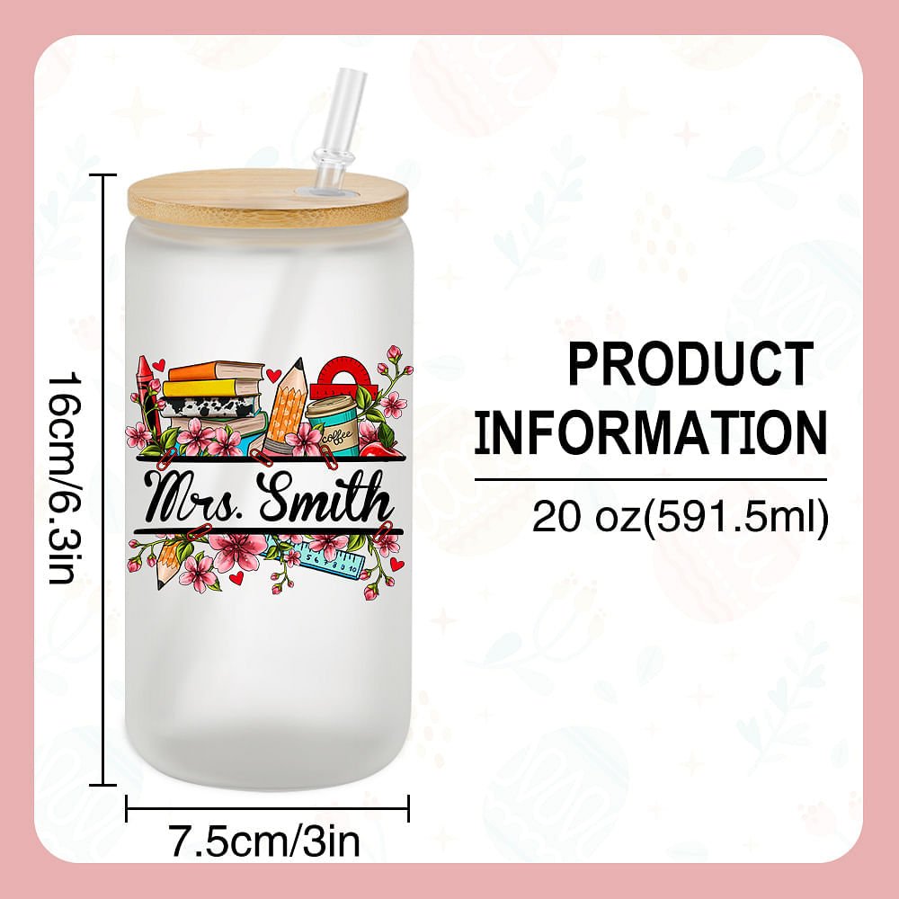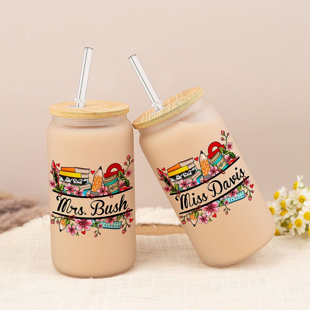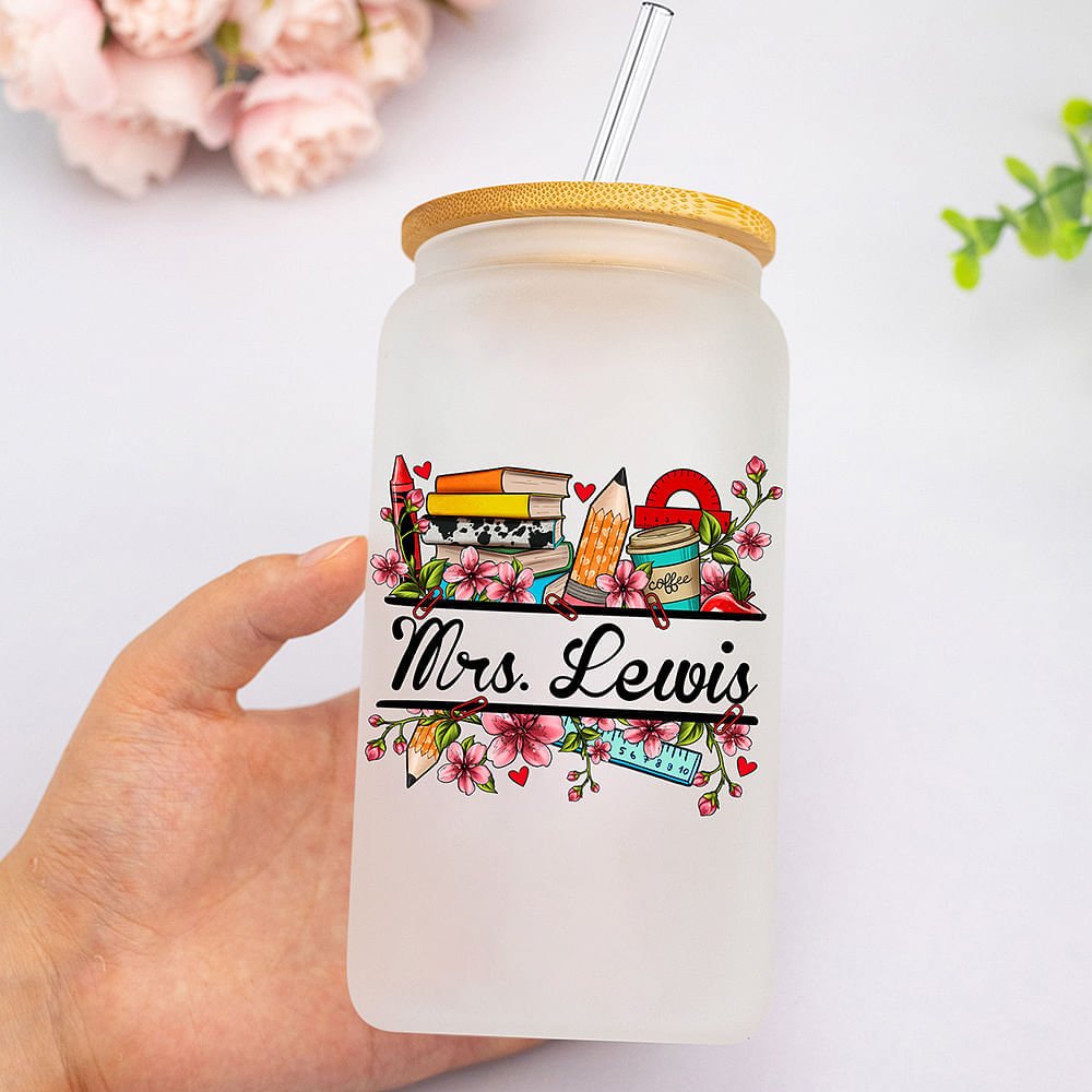 This frosted glass tumbler features a Personalized design with school supply elements, such as pencils, rulers, books, and crayons, combined with floral accents. The tumbler can be customized with the teacher's name, making it a unique and thoughtful gift.
