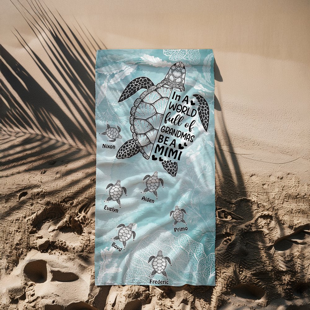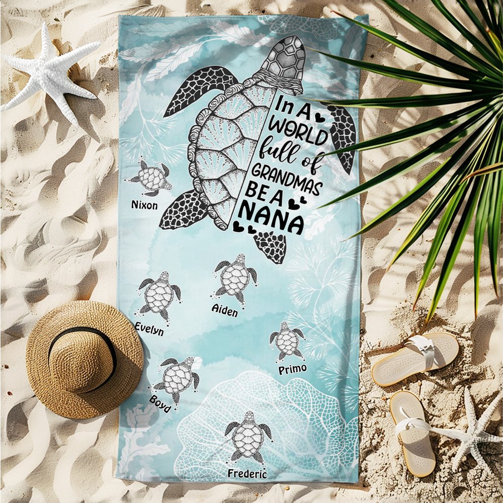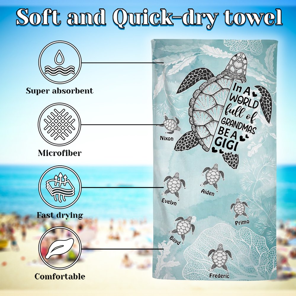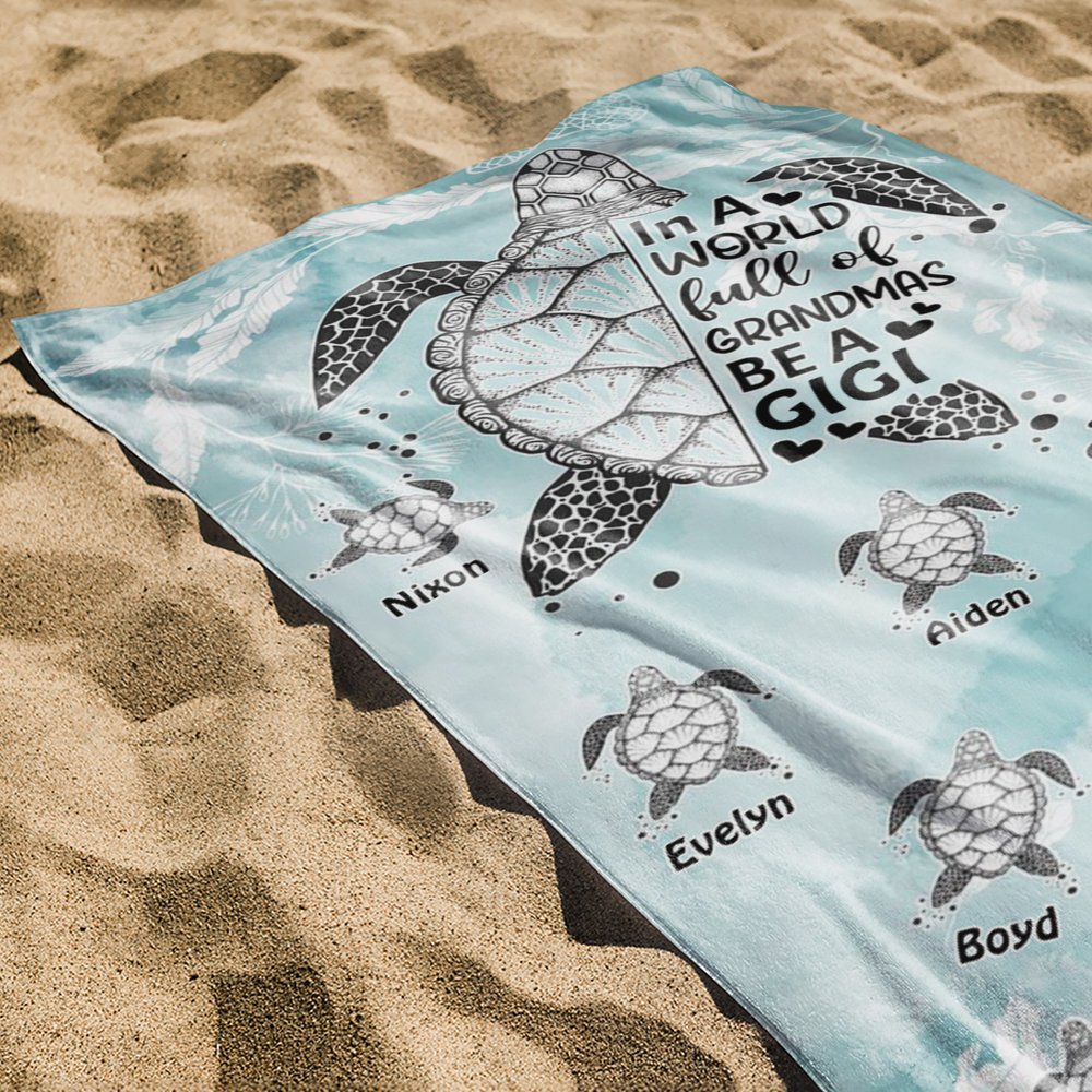 The emotions between animals are often warm and pure. Our quick-drying oversized beach towel features a grandma and baby turtle theme. There is also fixed text "In A World Full of Grandmas". You can add grandma and children's names to make it a special memory between you.