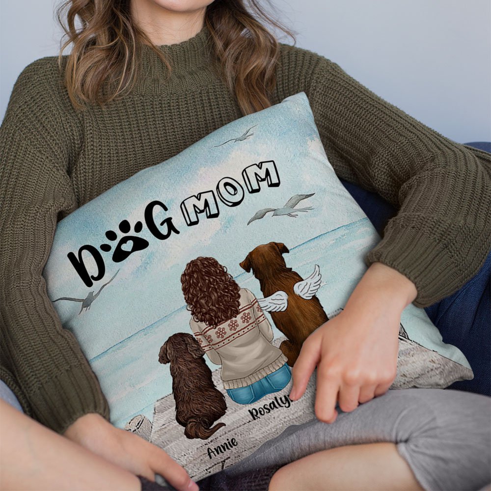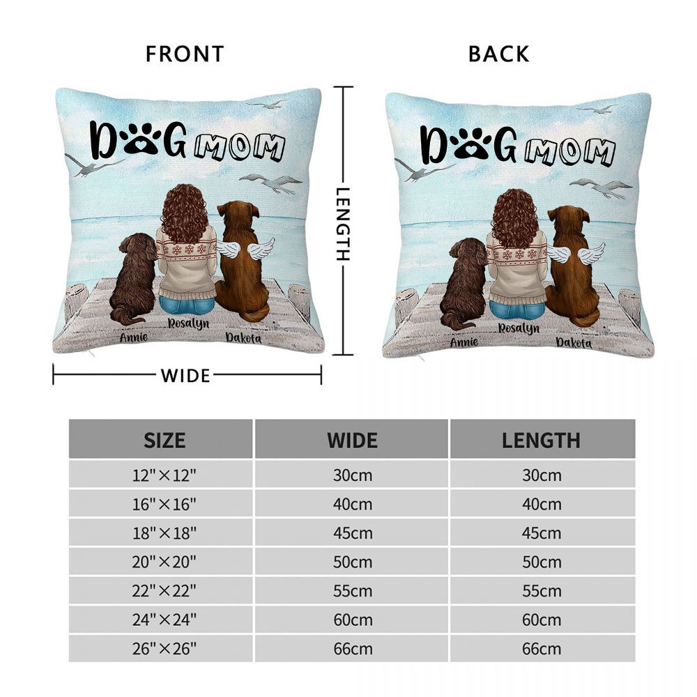 The unique design of this pillow features a charming scene, showcasing people and their dogs enjoying the seaside scenery together. With the quote "Dog Mom/Dog Dad" and Personalized message, it becomes an extra special keepsake to celebrate people's undying love for their furry friends.