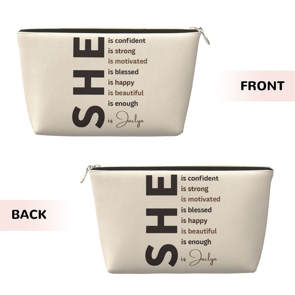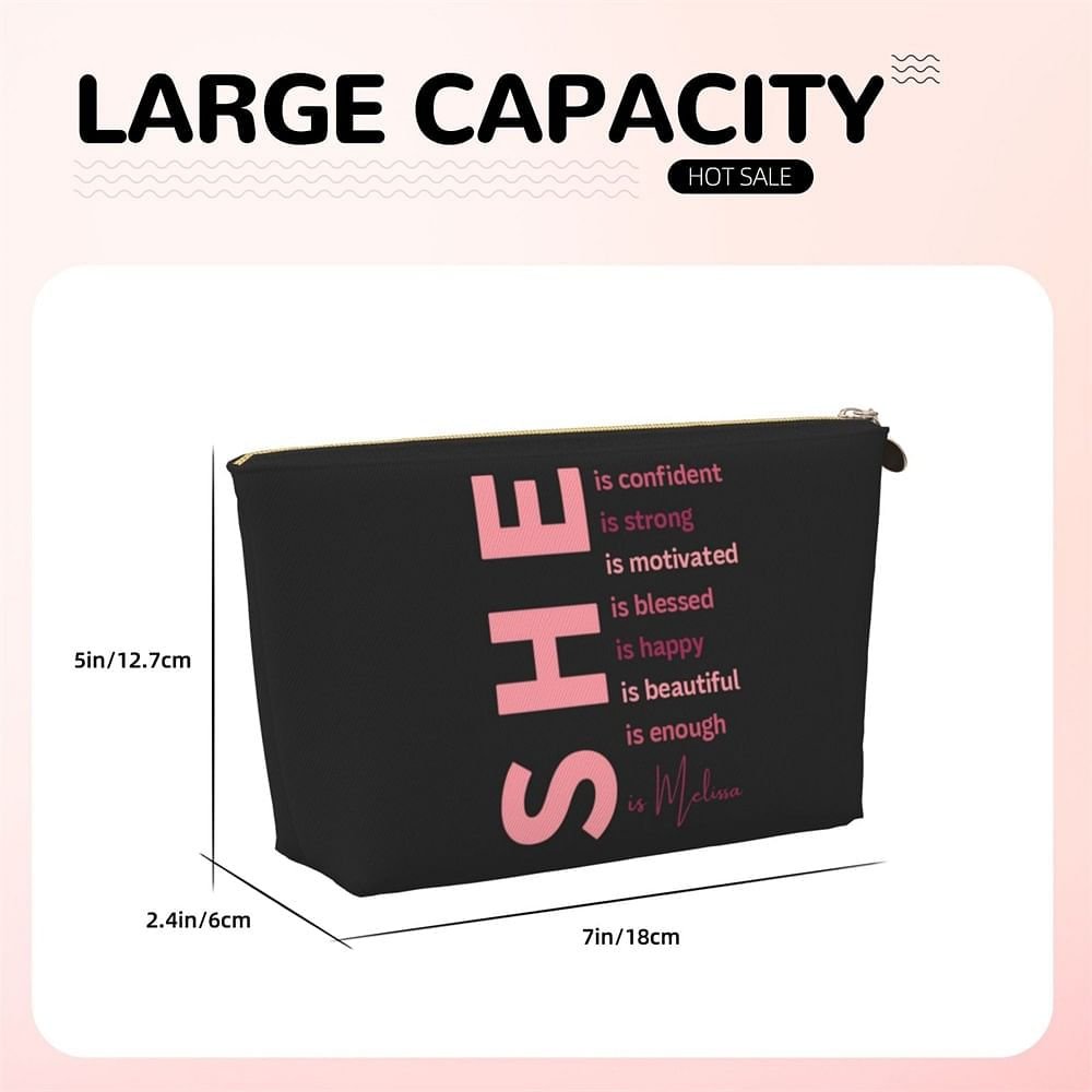 This makeup bag delivers an inspiring message with positive text, "She is confident/strong/motivated/blessed/happy/beautiful/enough," boldly printed on the bag. You can customize it with a name for a unique touch. Its vibrant colours and uplifting message protect your belongings and remind you daily of the beauty of strength, resilience, and self-care.
