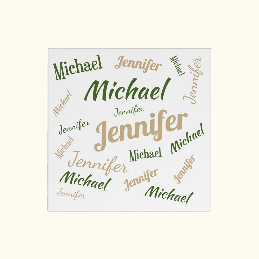 The word cloud signature style is a crowd favorite, choose your favorite colour combination and customize with your full name or two. Great gift to any deserving family or friend for birthdays, Mothers or Fathers Day, Valentine's Day, wedding anniversary, house warming or Christmas.
