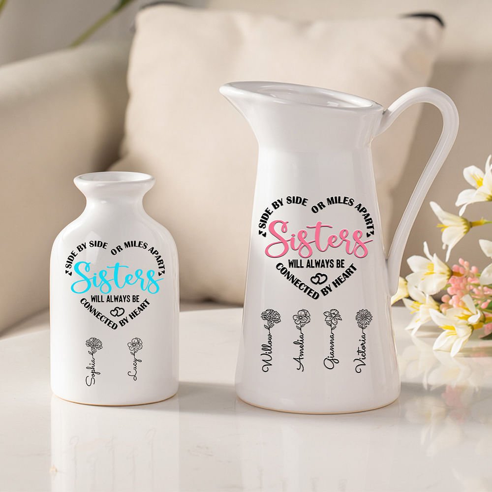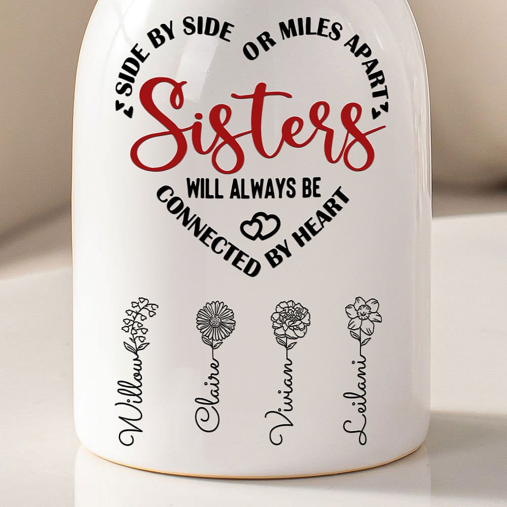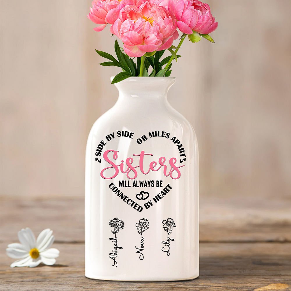 Our exquisite birth flower vase is printed with beautiful birth flowers, the heartfelt quote"Side by side or miles apart sisters will always be connected by heart" and you can customize 2-10 birth flowers and the corresponding names of your sisters or besties to express your love and affection to them.