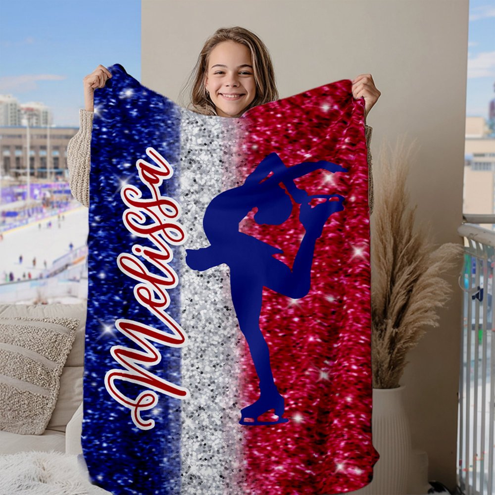 Featuring the graceful silhouette of a figure skater, this blanket perfectly captures the dynamic skating movements of a skater, seemingly capturing a moment from the ice. Customizable names are also available, adding a touch of exclusivity to the blanket. Whether in a romantic purple hue or a classic blue, white, and red colour scheme, it's visually appealing.